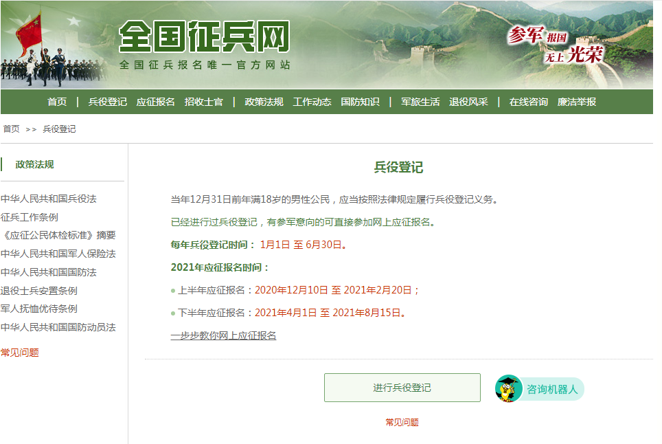2021年度男兵应征报名时间:上半年自2020年12月10日至2021年2月20日,下半年自2021年4月1日至2021年8月15日。