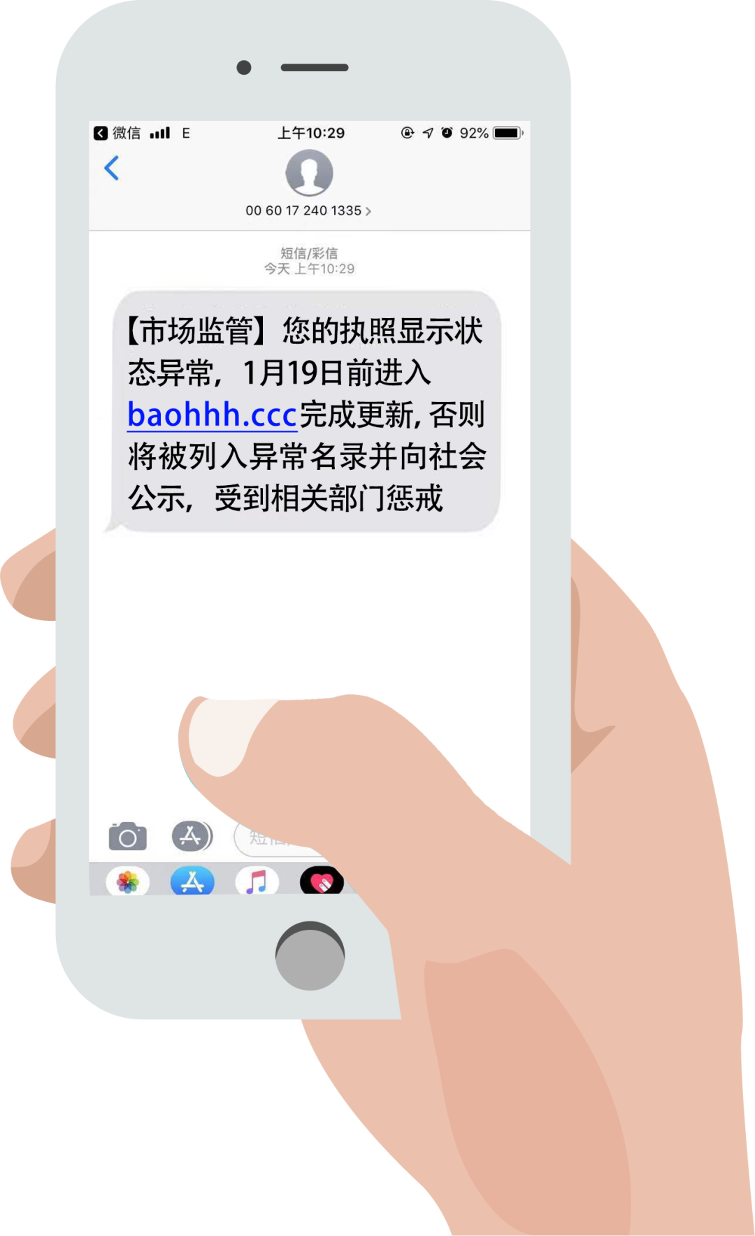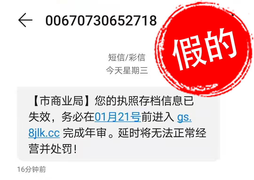 尊敬的家长朋友: 小李 你最近有收到过“市场监管”发来的短信通知吗? 收到过,你说的是不是这种短信↓↓↓ 小张 小李 对对对,就是这种短信,最近我身边有好多人都收到了。 什么? “市场监管”发的短信? 熊熊怎么不知道 广大市民注意了 年底将至 骗子要开始“冲业绩”了 这种短信是假的!假的!假的! 熊熊这就来给大家在线辟谣 但凡收到这种类型的短信 千万不要点击 一键删除 否则将损失惨重 01 2020年12月2日,市民龙某收到一条短信称其营业执照即将过期,恰巧在做小生意的龙某深信不疑的点开了短信提供的链接,在虚假平台上进行了“认证登记”并输入了银行卡号和下发的验证码,没过一会儿,其银行卡被转走30000元。 02 2020年12月14日,市民谢先生收到一条来自“市场监管”的短信,内容为“营业执照年报”,谢先生点击短信内的链接,进入了一个“统一全程电子化商事登记系统”的网站,谢先生根据网站提示输入了自己的银行卡号和手机号码后,手机随机收到一条验证码,其将验证码在网站回填后,显示验证码失败并被弹出了网站,不久谢先生就发现自己的银行卡被转账5000余元。 03 2020年12月21日,市民刘某收到一条关于营业执照即将过期的短信,点开里面的网址然后按照步骤操作,并将收到的银行短信验证码填入网址里。直到2021年1月4日刘某查看银行账户时发现被转走5000元。 真实案例 还有这些五花八门的短信内容 通通都是假的 ↓↓↓ Notice 类似的诈骗短信 Notice 一般诈骗套路是这样的 ↓↓↓ 1. 不法分子群发短信,引诱点击链接 2. 诱导至非法平台进行“认证登记” 3. 以身份登记为名,骗取个人隐私信息 广大经营者一定要擦亮双眼 切记不要点击! 不要回复! ★ 目前,企业、个体工商户、农民专业合作社年报网上填报的唯一途径为国家企业信用信息公示系统。 网址:http://sc.gsxt.gov.cn ★ 市场监管部门电子营业执照的下载和验证均为免费服务,不向市场主体收取任何费用。 ★ 使用电子营业执照不需要“更新认证电签版本”,不需要经营者提供银行资金账户信息,也不会“自动销户”。 !!! 如果你收到了此类短信 不确定到底是不是真的 还有一个办法 可打电话向属地市场监管部门咨询 @亲爱的家长们, 春节将至,且行且警惕!