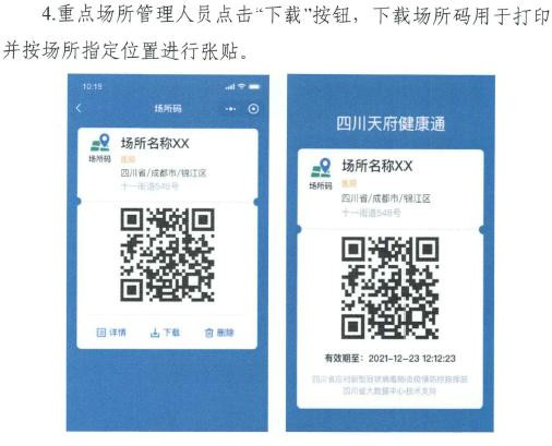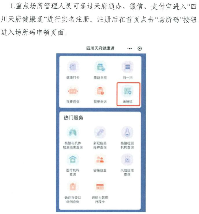 三、医疗机构、民政服务机构、校园、农贸市场、商场超 市、餐饮场所、会展场所、旅游场所、文化娱乐场所、体育场所、酒店宾馆、场站码头、公园、社区、小区等重点场所要在 入口醒目处张贴“四川天府健康通”场所码,所有进入人员“扫 码”通行。一般公共场所实行“亮码”通行。
