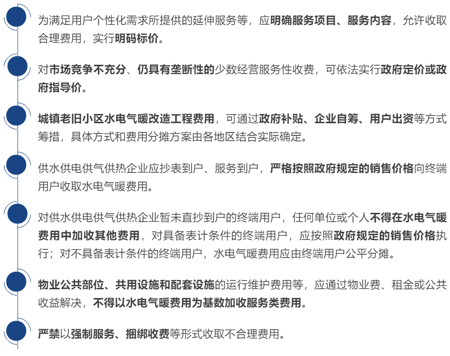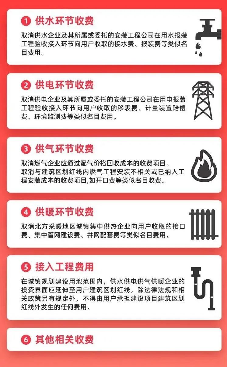 涉及供水、供电、供暖…… 其他费用 这些费用,严禁收取! 1、严禁政府部门、相关机构对供水供电供气供暖计量装置强制检定收费;检定费用由委托方支付,但计量装置经检定确有问题的,由供水供电供气供热企业承担检定费用,并免费为用户更换合格的计量装置。 2、严禁向用户收取水电气热计量装置费用。 3、任何单位代收供水供电供气供暖费时,严禁向用户加收额外费用。 4、建筑区划红线内供水供电供气供暖管网的建设安装、更新改造、维修维护等费用已由政府承担的,不得再向用户收取。 5、新建商品房、保障性住房等建筑区划红线内供水供电供气供暖管线及配套设备设施的建设安装费用统一纳入房屋开发建设成本,不得另外向买受人收取;投入使用后,可依法依规移交给供水供电供气供热企业实行专业化运营管理,相关运行维护等费用纳入企业经营成本。 这些收费行为 严格规范!