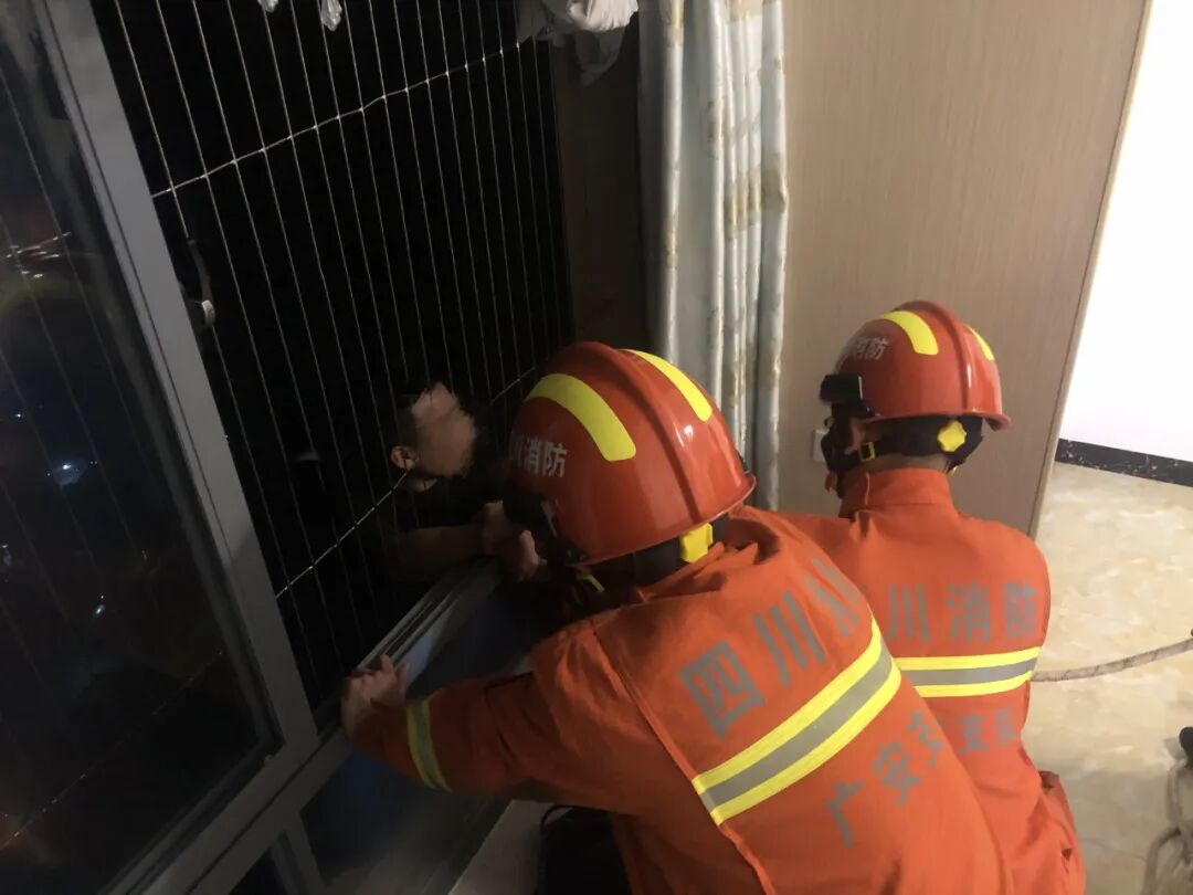 今日凌晨2点 广安一男子被“挂”29楼窗外 命悬一线! 3月6日凌晨02时11分,广安消防幸福街消防救援站接到指挥中心调度称:新天地小区有人被困29楼窗外,急需救援。幸福街消防救援站出动一车六人火速赶赴现场。 02时20分,指战员赶到现场后看到,一名男子“挂”在29楼客厅的窗户外,双手紧紧抓住防护栏,离地面90多米,稍有不慎就有坠楼的危险。“太吓人了!半夜睡觉突然惊醒,发现窗户外边有个人!我这可是29楼啊!”该住户激动地描述着。 经现场勘察后发现,由于楼层较高加上有防护栏,男子无法进入室内,唯有“破窗”才能迅速救人。现场救援人员首先利用保护绳固定该男子腰部,防止其出现因体力不支而松手掉落的情况,随后,救援人员利用电动剪切钳对防护栏进行剪切。 经过10来分钟的紧张作业,防护栏被成功剪切出一个可供人钻出的缺口。救援人员合力救出男子后,将现场交由民警处置,收整器材归队。