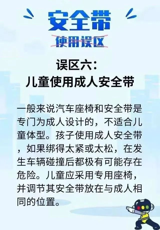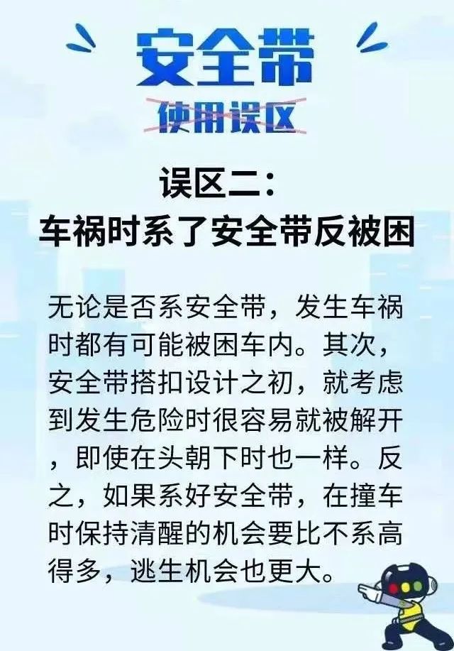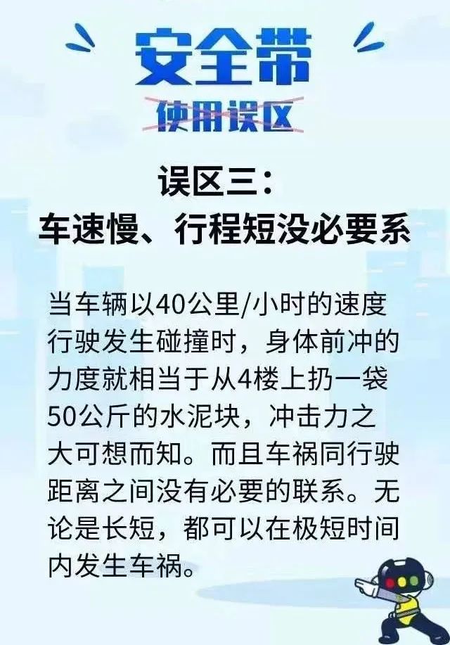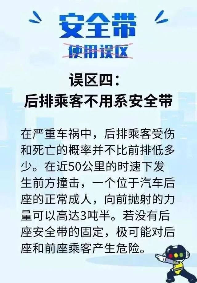 殊不知当车辆发生交通事故时,后排乘坐人如未系安全带,因没有安全气囊的缓冲和保护,可能会撞击到前排座椅、顶棚、前挡风玻璃、仪表台,甚至被直接甩出车外,严重威胁自身和前排驾乘人的生命安全。 数据表明 机动车驾乘人员未系安全带 发生事故死亡率 是系安全带的37.7倍 发生事故从车尾甩出的乘员 75%会因伤势过重身亡 而系上安全带将大大提高安全保护作用 安全带不是系给交警看的 后排安全带绝对不是摆设 关键时刻 安全带就是救命稻草!