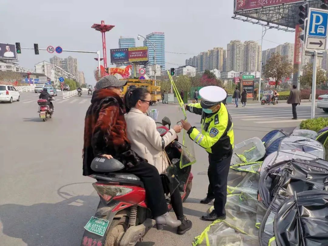 在大西街与滨河西路十字路口,岳池县公安局交通警察大队一中队的交警,正在该路口对过往的非机动车,非法加装遮阳伞蓬进行收缴,并现场开展宣传劝导工作。