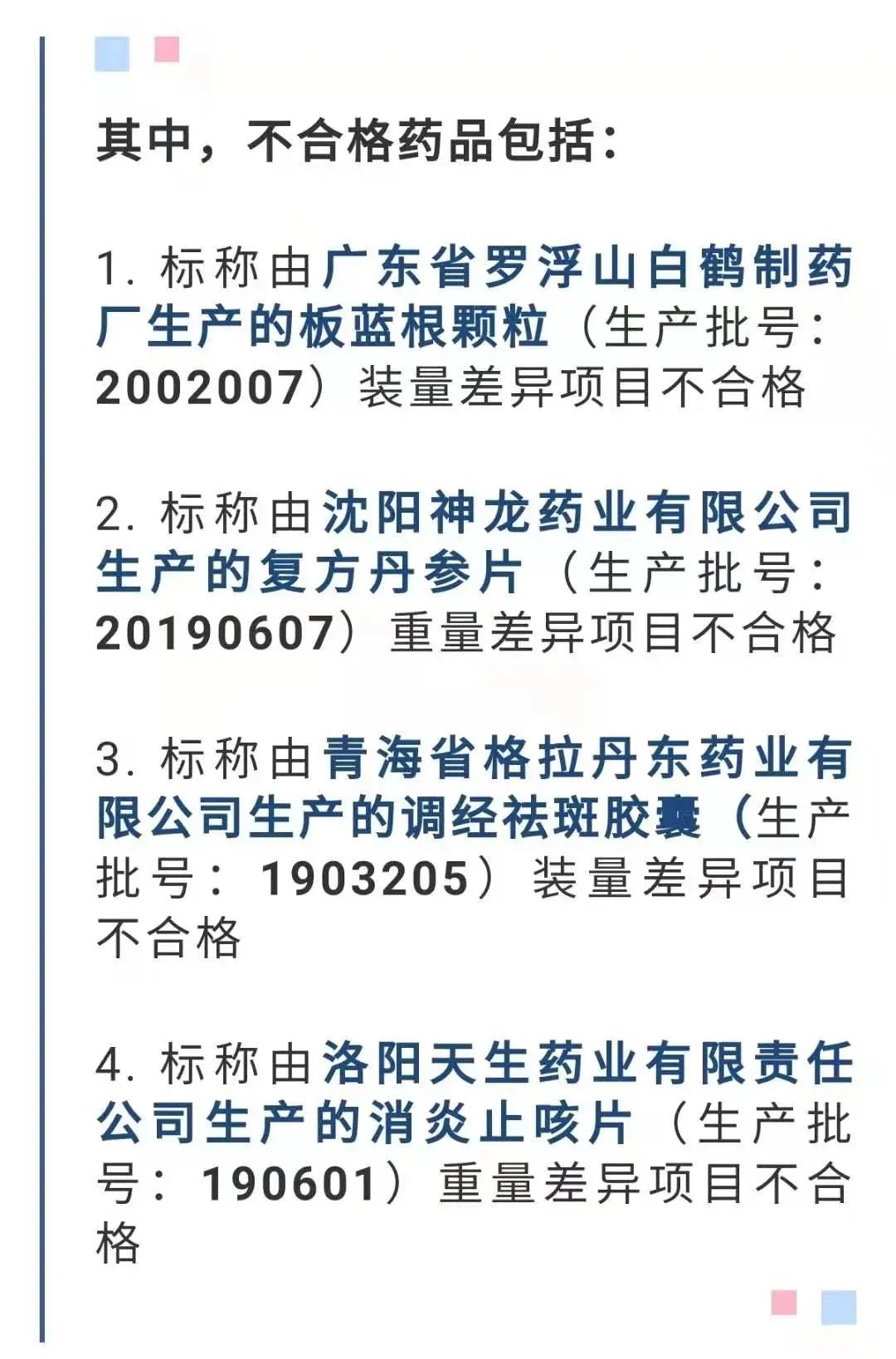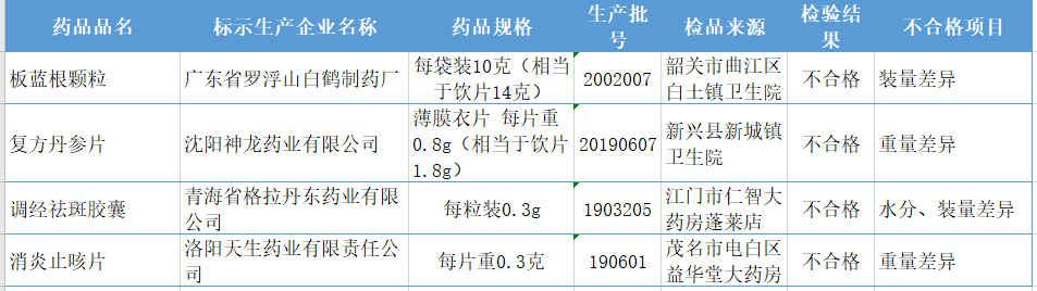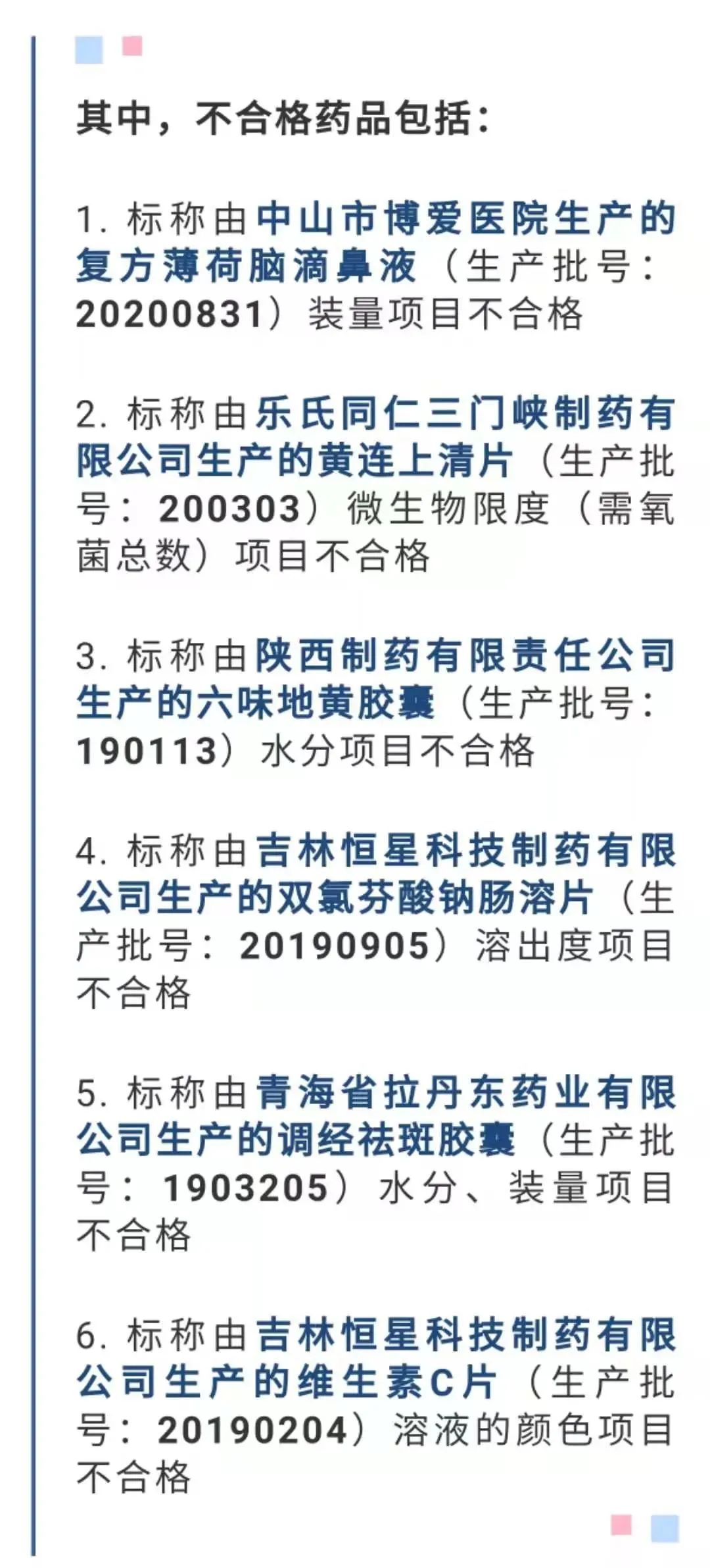 据悉 此次共抽查检验 43个药品生产企业、550个药品经营企业 和163个医疗机构 经核查确认,本期抽验 有827个品种1892批次经检验 符合药品标准规定 9个品种9批次经检验不符合药品标准规定 主要不符合规定项目 有装量差异、重量差异、装量 微生物限度、水分及溶出度等