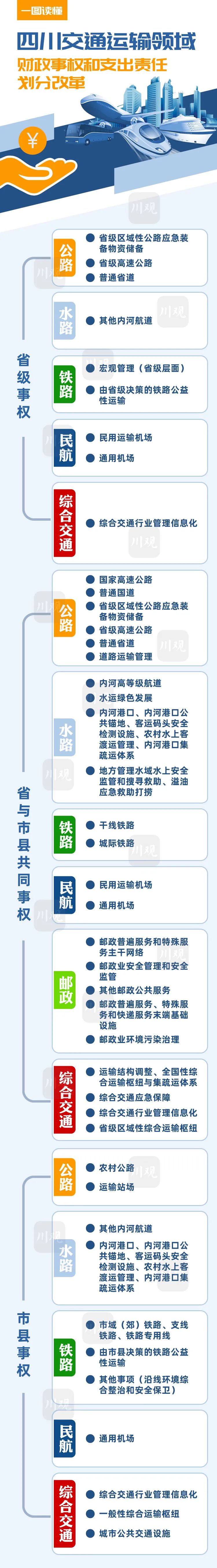 这次《方案》一共把公路、水路、铁路、民航、邮政、综合交通6个方面的省与市县财政事权和支出责任划分清楚了。