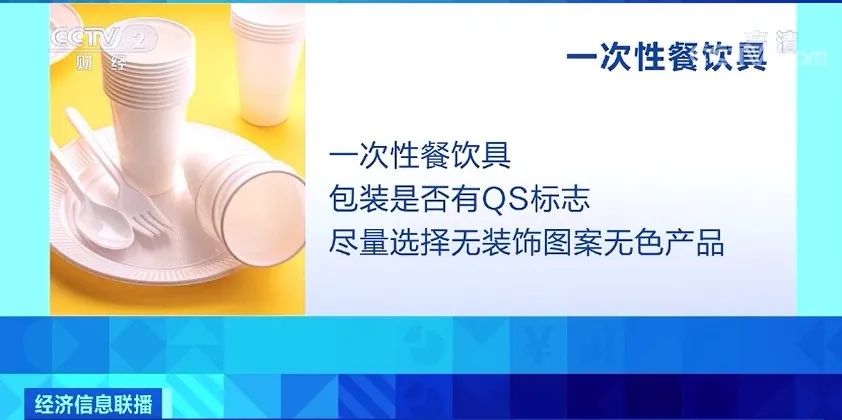 一次性餐饮具,消费者选购时应选择包装完好的产品,看清外包装上是否有QS标志等关键信息,尽量选择没有装饰图案的无色产品,尽量不要选择捏起来太软的产品。