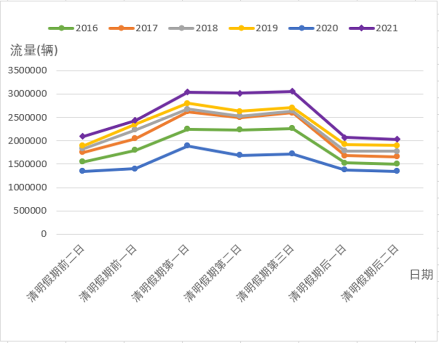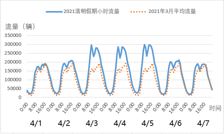 三是早晚高峰期交通压力增加。清明假期每日车流量高峰分别出现于上午11时和下午17时。预计4月3日上午11时车流量达到整个清明假期的最大值,小时车流量达到29.5万辆。