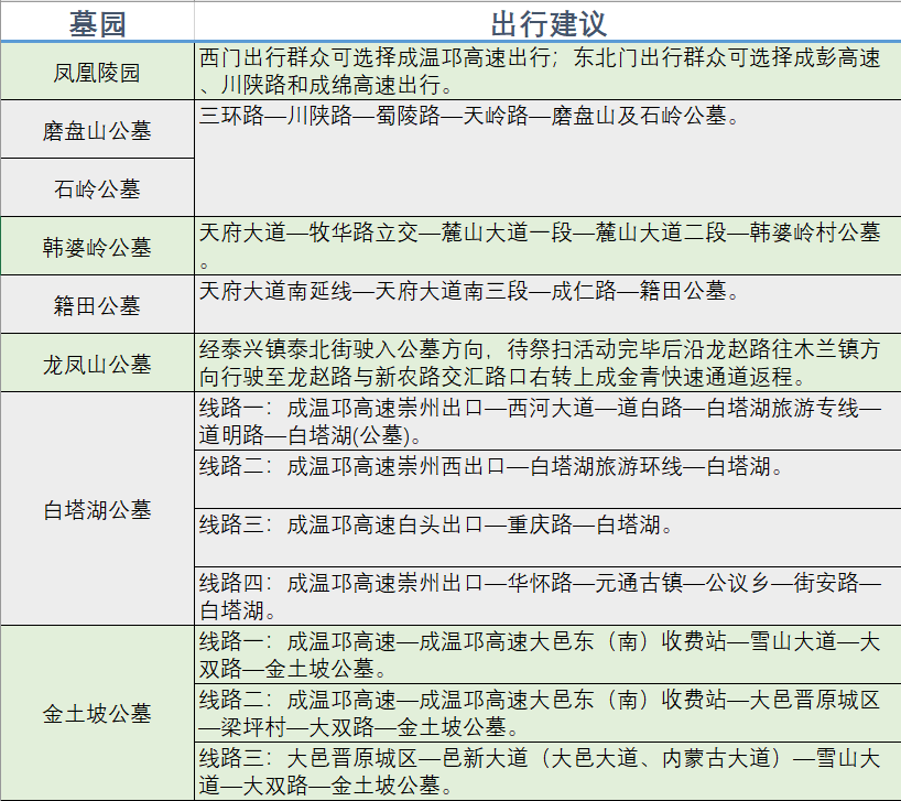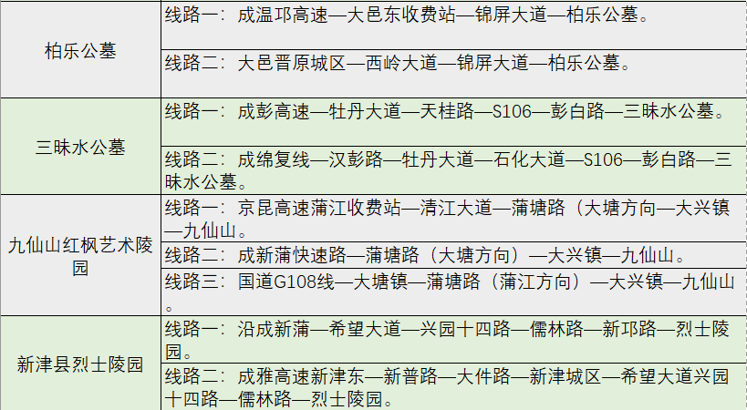 ▼表6 清明假期成都市墓园驾车路线建议
