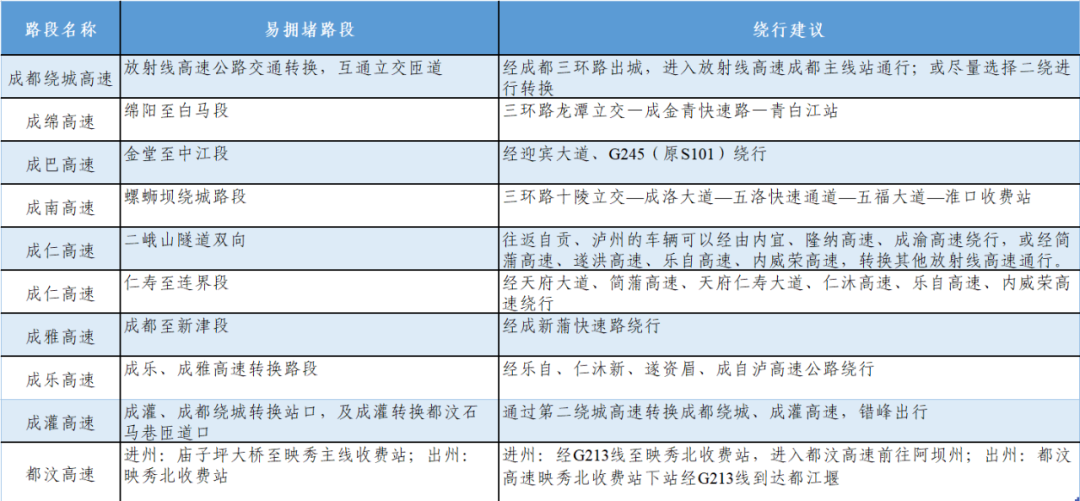 综合分析高速路流量、货车流量、热门景点以及民众出行偏好,假期四川省高速公路易堵路段以及出行建议如下所示。