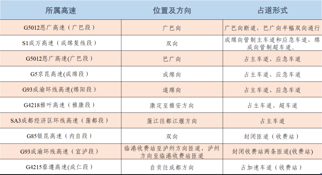 ▼表5 清明假期高速公路无法撤场主要施工路段一览表