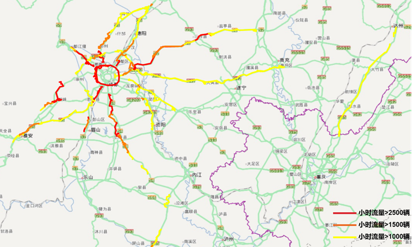 四是路网流量以中心城市为核心呈放射状分布。路网流量围绕成都等中心城市呈放射状分布,成都市周边各主线站以及连通主线站的环线高速车流量最为密集。成渝环线遂宁段、渝蓉高速将承受较大进出川压力。