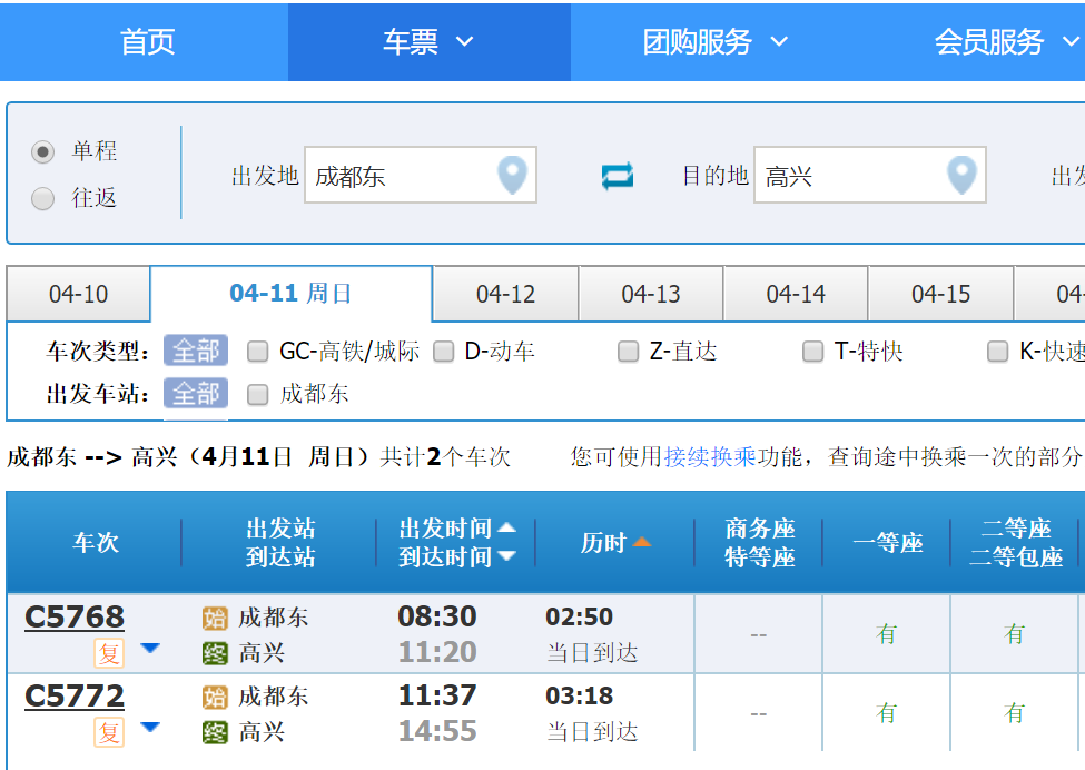 C5768,8:30成都东出发,11:20到达华蓥高兴;C5772,11:37成都东出发,14:55到达华蓥高兴。