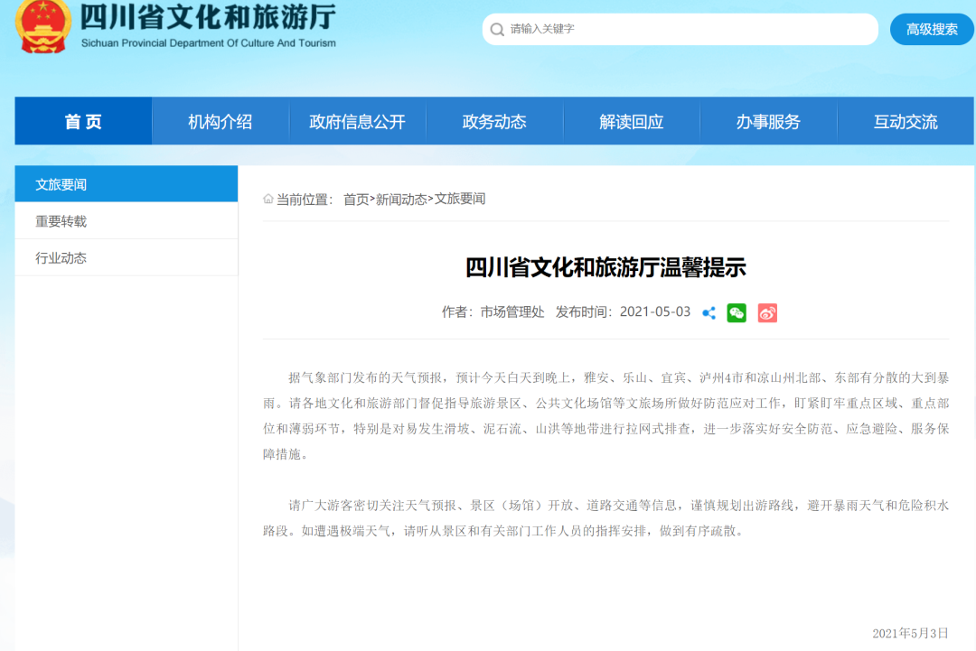 5月3日,四川省文化和旅游厅发布温馨提示:据气象部门发布的天气预报,预计今天白天到晚上,雅安、乐山、宜宾、泸州4市和凉山州北部、东部有分散的大到暴雨。请各地文化和旅游部门督促指导旅游景区、公共文化场馆等文旅场所做好防范应对工作,盯紧盯牢重点区域、重点部位和薄弱环节,特别是对易发生滑坡、泥石流、山洪等地带进行拉网式排查,进一步落实好安全防范、应急避险、服务保障措施。请广大游客密切关注天气预报、景区(场馆)开放、道路交通等信息,谨慎规划出游路线,避开暴雨天气和危险积水路段。如遭遇极端天气,请听从景区和有关部门工作人员的指挥安排,做到有序疏散。