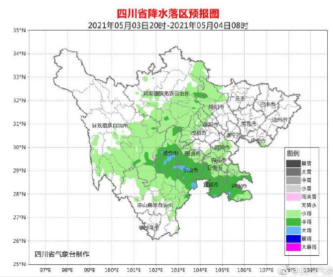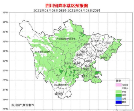 另据@四川气象 消息,今天(3日)白天到晚上:广元、绵阳、德阳、成都、巴中、南充、遂宁7市多云间阴天有4~6级偏北风,盆地其余地方阴天有阵雨或雷雨,其中雅安、乐山、宜宾、泸州4市的部分地方有中雨,局部大雨;