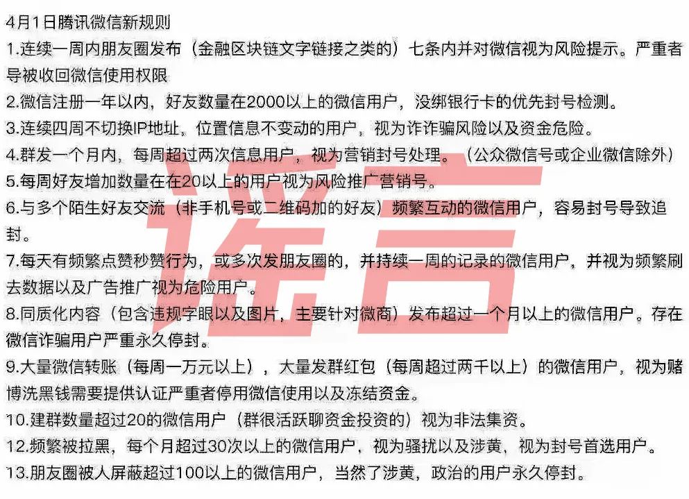 谣言:网传微信新规↓↓↓ 真相: 以上列举内容纯属无端揣测,请大家不要轻信。微信会根据用户投诉对违规帐号进行处理 。在对用户提交证据进行核实后 ,我们会依照国家相关法律法规以及《微信个人帐号使用规范》、《腾讯微信软件许可及服务协议》,结合帐号具体违规程度来进行相应梯度处理 。 (微信团队)