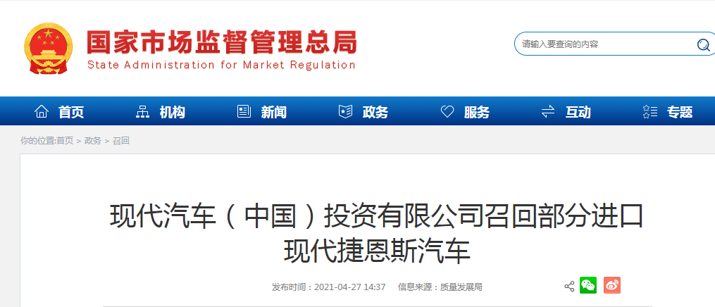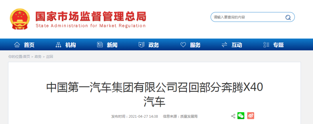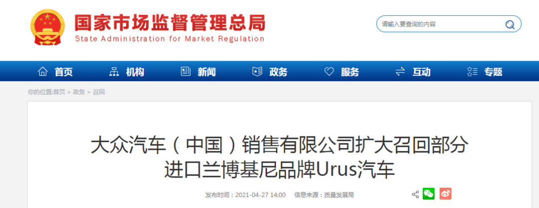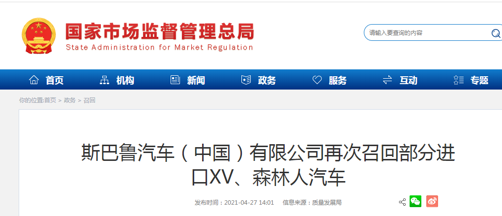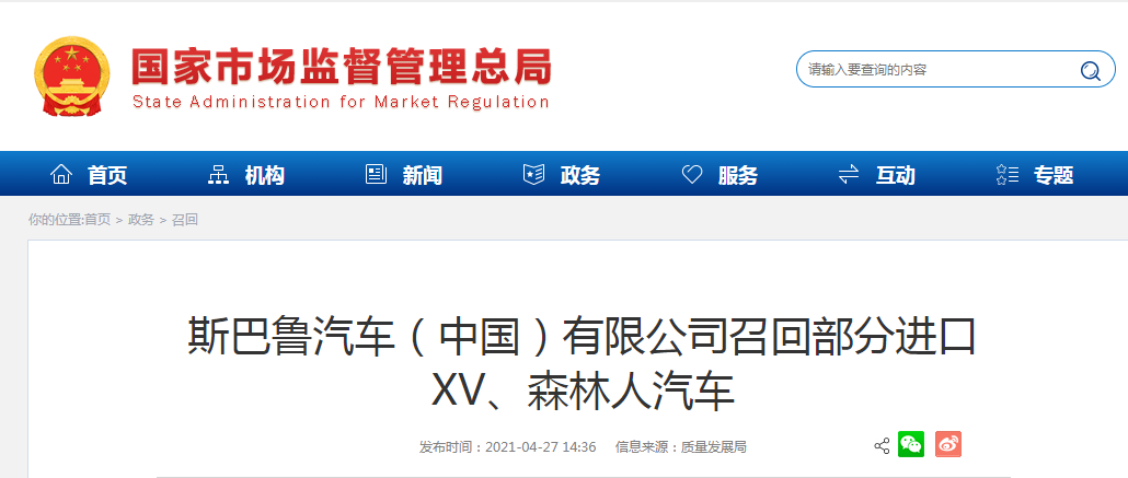 中国第一汽车集团有限公司 召回部分奔腾X40汽车 自2021年7月23日起,召回2019年4月24日至2020年9月4日期间生产的部分2019款奔腾X40,共计43087台。 本次召回范围内车辆由于碳罐总成设计存在瑕疵,在车辆正常行驶过程中,有可能出现车辆异常熄火,在极端情况下,有导致车辆发生事故的风险,存在安全隐患。 一汽奔腾轿车有限公司将为召回范围内的车辆免费检查更换新结构碳罐总成,以消除安全隐患。 现代汽车(中国)投资有限公司 自2021年6月15日起,召回以下进口现代捷恩斯汽车,共计1703辆: (1)2014年1月29日至2016年3月21日生产的现代捷恩斯3.0 GDI 2WD汽车,共计582辆; (2)2014年6月21日至2016年4月22日生产的现代捷恩斯3.0 GDI 4WD汽车,共计1069辆; (3)2014年2月6日至2014年12月29日生产的现代捷恩斯3.3 GDI 2WD汽车,共计11辆; (4)2014年9月19日至2015年8月18日生产的现代捷恩斯3.3 GDI 4WD汽车,共计41辆。 本次召回范围内部分车辆的制动系统液压电子控制单元(HECU)内部可能发生短路,极端情况下会导致发动机舱起火,存在安全隐患。 现代汽车(中国)投资有限公司将为召回范围内的车辆免费更换保险盒内相关保险丝,将大容量保险丝更换为较低容量保险丝。若HECU内部发生短路,较低容量的保险丝会及时熔断,可避免因短路导致车辆起火的风险,以消除安全隐患。车辆召回更换保险盒内保险丝后,如后续出现HECU内部短路导致保险熔断问题,无论车辆使用年限和行驶里程,现代汽车(中国)投资有限公司将为用户车辆免费更换HECU。出现该问题时,建议用户立即联系4S店或拨打进口现代汽车客户电话:400-885-3388,就近进店检查维修以解决车辆问题。 斯巴鲁汽车(中国)有限公司 自2021年6月25日起,召回部分进口XV、森林人系列汽车,共计21335辆,具体如下: (1)2017年8月9日至2019年4月26日期间生产的部分进口2018-2019年款XV系列汽车,共计7873辆。 (2)2018年9月3日至2019年5月31日期间生产的部分进口2019年款森林人系列汽车,共计13462辆。 本次召回范围内的车辆,因后平衡杆支架与车体连接面的平面精度存在制造偏差,导致后平衡杆支架安装螺栓在紧固时缩小连接面间隙的同时造成了一定的螺栓预紧力损失。可能造成车辆行驶过程中,后平衡杆支架安装螺栓松动甚至脱落。如果在该螺栓脱落的状态下持续行驶,后平衡杆可能会伤及制动管路、后驱动轴、后副车架等周边部件,影响行车安全,存在安全隐患。 斯巴鲁汽车(中国)有限公司将为所有对象车辆免费检查后平衡杆支架安装螺栓的安装状态,并将螺栓紧固至规定扭矩。另外,如果发现螺栓已脱落则安装新的螺栓,并对可能伤及的制动油管、后驱动轴、后平衡杆、平衡杆连杆、平衡杆支架、后副车架等周边部件进行检查,如有损坏则进行相应维修、更换,以消除安全隐患。 斯巴鲁汽车(中国)有限公司 自2021年6月25日起,再次召回部分进口XV、森林人系列汽车,共计17479辆,具体如下: (1)2017年8月9日至2019年8月1日期间生产的部分进口2018-2019年款XV系列汽车,共计6992辆。 (2)2018年9月3日至2019年6月19日期间生产的部分进口2019年款森林人系列汽车,共计10487辆。 本次召回是对2019年11月12日发布的关于点火线圈缺陷的《斯巴鲁汽车(中国)有限公司召回部分进口森林人、XV汽车》召回活动的再次召回。前次的召回措施虽然针对车辆发动机控制单元的控制程序进行了改善升级,可以防止发动机控制程序对点火线圈过度通电造成新的损坏。 斯巴鲁汽车(中国)有限公司将为召回范围内全部车辆免费更换新的点火线圈,以消除安全隐患。 大众汽车(中国)销售有限公司 自2021年4月27日起,召回2020年7月22日至2020年7月28日期间生产的部分进口2020年款Urus系列汽车,共计9辆。 本次召回范围内的车辆由于供应商的制造原因,发动机舱内的燃油供油管的快速接头在长期高温的情况下可能发生热降解,极端情况下快速接头处可能出现裂纹并导致燃油泄漏,当遇到明火时可能造成发动机舱起火,存在安全隐患。 大众汽车(中国)销售有限公司将通过兰博基尼品牌授权经销商,为召回范围内的车辆免费更换燃油供油管(包括改进后的快速接头),以消除安全隐患。