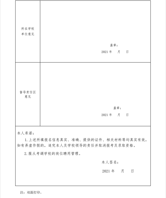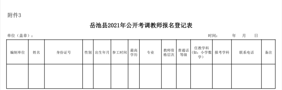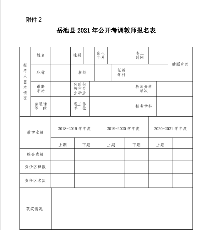 2.《岳池县2021年公开考调教师报名表》(附件2,编制学校须签署是否符合报考条件的意见);
