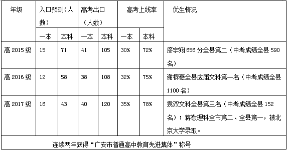 招生对象 广安市2021届初中应届毕业生 招生计划 400人,共8个班。 招生代码 北京师范大学广安实验学校 63304 录取批次 普通高中第一批 收费标准 按“岳发改【2021】12号”文件核定的收费标准,学费8000元/期 奖励政策 1.依据初三二诊/中考成绩,优秀者给予丰厚的奖学金: 2.高考奖:就读北大、清华,给予100000元的助学金。 一流的教学质量 高考成绩年年攀升: 现各年级广安市期末统考情况: 高2021级教师团队 陈富强,已在我校任教六年。中学语文高级教师,市语文课堂竞赛一等奖获得者;所带班获“四川省先进班集体”称号,高考一本上线率82%,本科上线率100%。 蒋新强,已在我校任教六年。中学语文高级教师,高中语文教研组长。市优秀教师,优秀班主任。荣获广安市班主任风采大赛一等奖。所教学生多次获县、市状元,所带班高考一本上线率78%,本科上线率100%。 刘朝金,已在我校任教六年。中学数学高级教师,四川省优秀教师,四川省骨干教师,四川省数学学会会员,四川省优秀班主任。所带学生勇夺广安市理科状元,被北京大学、清华大学、北京航空航天大学、复旦大学、上海交大等名校录取。所带班高考一本上线率91%,本科上线率100%。 罗中明,已在我校任教五年。中学数学高级教师,市级骨干教师,岳池县第四届百名优秀人才,广安市优秀教师。培养了多名县状元和数学单科状元。 陈安平,已在我校任教六年。中学英语高级教师,广安市骨干教师,广安市“最具风采班主任”,岳池县红烛奖获得者,广安市普通高中先进个人。培养了多位县状元和英语单科状元,多名学生被双一流大学录取。所带班级曾被评为省先进班级体,高考一本上线率85%,本科上线率100%。 何燕,已在我校任教一年。中学英语高级教师,四川省骨干教师,长期任教成都、绵阳等地名校。所教学科高考平均分多次名列全市第一。先后有50多位学生被北京大学、清华大学、中国人大、上海交大等国内知名大学录取。已带过8届高三毕业班,所带班高考一本上线率92%,本科上线率100%。 刘杰,已在我校任教六年。中学物理高级教师,四川省新课程骨干教师。从教15年来,长期担任班主任和年级组长,所带班级曾多次获得市、县“优秀班集体”称号,所教学生获得物理学科广安市第一。 匡远胜,已在我校任教四年。中学物理高级教师。十多年来一直担任班主任工作,所教学科在高考中成绩优异,荣获岳池县高考卓越贡献奖,所教学生多人考入电子科大,重庆大学等名校。所带班级多次被评为广安市优秀班集体,高考一本上线率76%,本科上线率90%以上。 卢朝跃,已在我校任教六年。中学化学高级教师,四川省教科研专家,广安市教科研先进个人,广安市学科教学指导教师,广安市教育学会化学学会会员,广安市化学学科联教组中心成员,广安市骨干教师培训化学科指导教师,广安市国培化学科指导教师,岳池县优秀教师,红烛奖获得者。所教学生多人被北京大学、南开大学等名校录取。所带班获得过“省级先进班集体”称号,高考一本上线率达93%,本科上线率100%。 郭贵云,已在我校任教五年。中学生物高级教师,广安市名师,岳池县生物学科带头人,曾获得省、市课堂大赛一等奖。培养了多位县状元和生物单科状元,所教学生多人被985、211等名校录取。 袁蓉,已在我校任教三年。西南大学优秀毕业生,中学生物高级教师,广安市骨干教师,原岳池中学"零班"生物教师。教学业绩突出,所教学生中有岳池县理科状元,生物单科状元以及全国生物联赛省一等奖获得者。 唐宗贵,已在我校任教三年。中学政治高级教师,省名师工作坊坊主,省级教学名师,省级骨干教师,省教科研专家库专家,西南大学硕士研究生兼职指导教师;广安市教育学会德育专委会副理事长、广安市学科指导专家、广安市联教组中心组成员、广安市普通高中教育先进个人、广安市最具风采班主任、广安市优秀教师;华蓥市高中教育先进个人、华蓥市优秀教师、华蓥市高考先进个人、华蓥市课改先进个人。带出广安市文科状元3人,3名学生被北京大学录取。 石华园,已在我校任教两年。中学政治高级教师,法学硕士学位。市骨干教师、市十佳班主任。所带学生多人获得市单科第一名。 吴才银,已在我校任教六年。中学历史高级教师,广安市名师工作坊成员,岳池县骨干教师,所带班级多次被评为市优秀班集体,所教学生两次夺得文科状元。 赵玉平,已在我校任教三年。中学历史高级教师,广安市优秀教师。所带班历史教学成绩突出,培养了两名文科状元。 于复亮,已在我校任教五年。中学地理高级教师,原岳池中学文科零班、复习班班主任及地理教师。岳池县“红烛奖”获得者,市县骨干教师,县联教组中心成员。所教多名同学考入兰州大学、电子科大、武汉理工大学、重庆大学等一流名校。 突出的德育教育 多元的成才教育 高效的智慧课堂 卢老师13982656670 王老师13882679790 陈老师13629093718