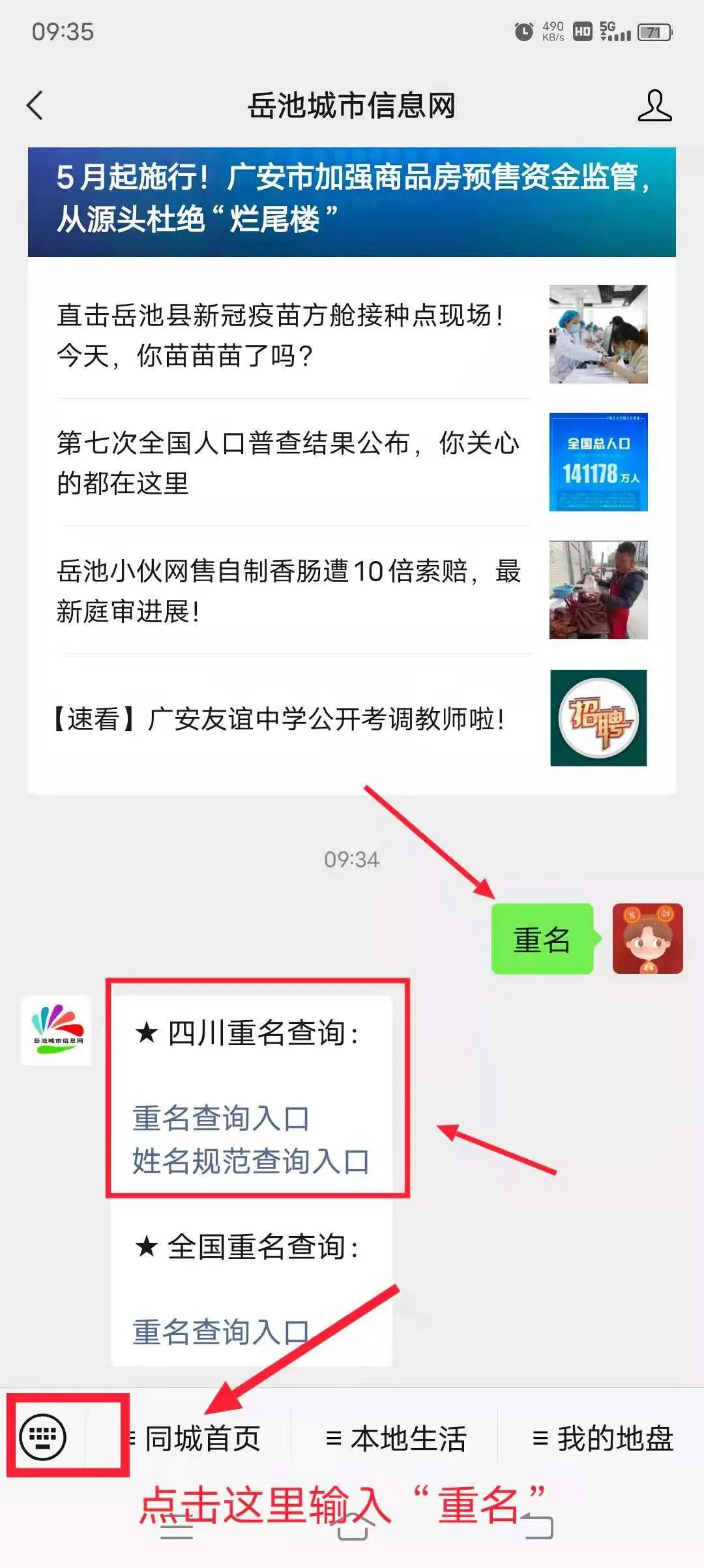 在【岳池城市信息网】微信对话框发送【重名】