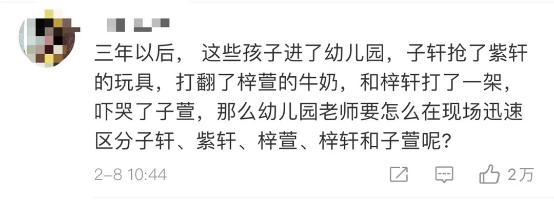 如果不知道怎么取 不如先来看看公安部发布的 《二〇二〇年全国姓名报告》 ↓↓ 2020年 最受欢迎的新生儿名字有哪些? “百家姓”排名情况如何呢? 一起来八卦一下! 2020年“百家姓”排名公布 按户籍人口数量排名 2020年的“百家姓”与2019年相比 变化不大 “王”“李”“张”“刘”“陈” 依旧名列前五 五大姓氏人口总数占全国户籍总人口的30.8% 图片来源:公安部网站 截止到2020年12月31日,2020年“百家姓”中新生儿登记姓氏最多的是“李”,共72.6万人,最少的是“顾”,仅1.7万人。 图片来源:公安部网站 2020新生儿“爆款”名字出炉 此外,2020年出生并已经进行户籍登记的新生儿名字中,使用频率最高的50个字依次为“梓”“子”“宇”“辰”“一”等。 与2019年相比,“玥”“伊”“昕”“可”等字受到新生儿父母的青睐。 图片来源:公安部网站 2020年出生并已经进行户籍登记的男性新生儿中,使用频率最高的10个名字依次为:“奕辰”“宇轩”“浩宇”“亦辰”“宇辰”“子墨”“宇航”“浩然”“梓豪”“亦宸”。与2019年相比,“奕辰”首次入围并登顶榜首,成为男性新生儿父母起名的首选,“亦辰”“宇辰”“亦宸”也进入前十。 图片来源:公安部网站 2020年出生并已经进行户籍登记的女性新生儿中,使用频率最高的10个名字依次为:“一诺”“依诺”“欣怡”“梓涵”“语桐”“欣妍”“可欣”“语汐”“雨桐”“梦瑶”。与2019年相比,“一诺”“依诺”“欣怡”依旧位列三甲,“语桐”“可欣”“语汐”“梦瑶”进入前十。 图片来源:公安部网站 对此,已经有网友“脑补”了一出大戏 “当子轩遇到了紫轩、子萱、梓萱.......” 取名字真不是一件容易的事 有朋友想知道 成都/全国有多少人和自己同名? 其实早就可以上网查啦! 四川范围内重名查询 想知道自己名字是否特别 四川还有多少人与自己重名 长按下方二维码 关注【岳池城市信息网】公众号 关注“岳池城市信息网” 在聊天对话框发送【重名】 查询四川有多少人和你重名 全国范围内重名查询