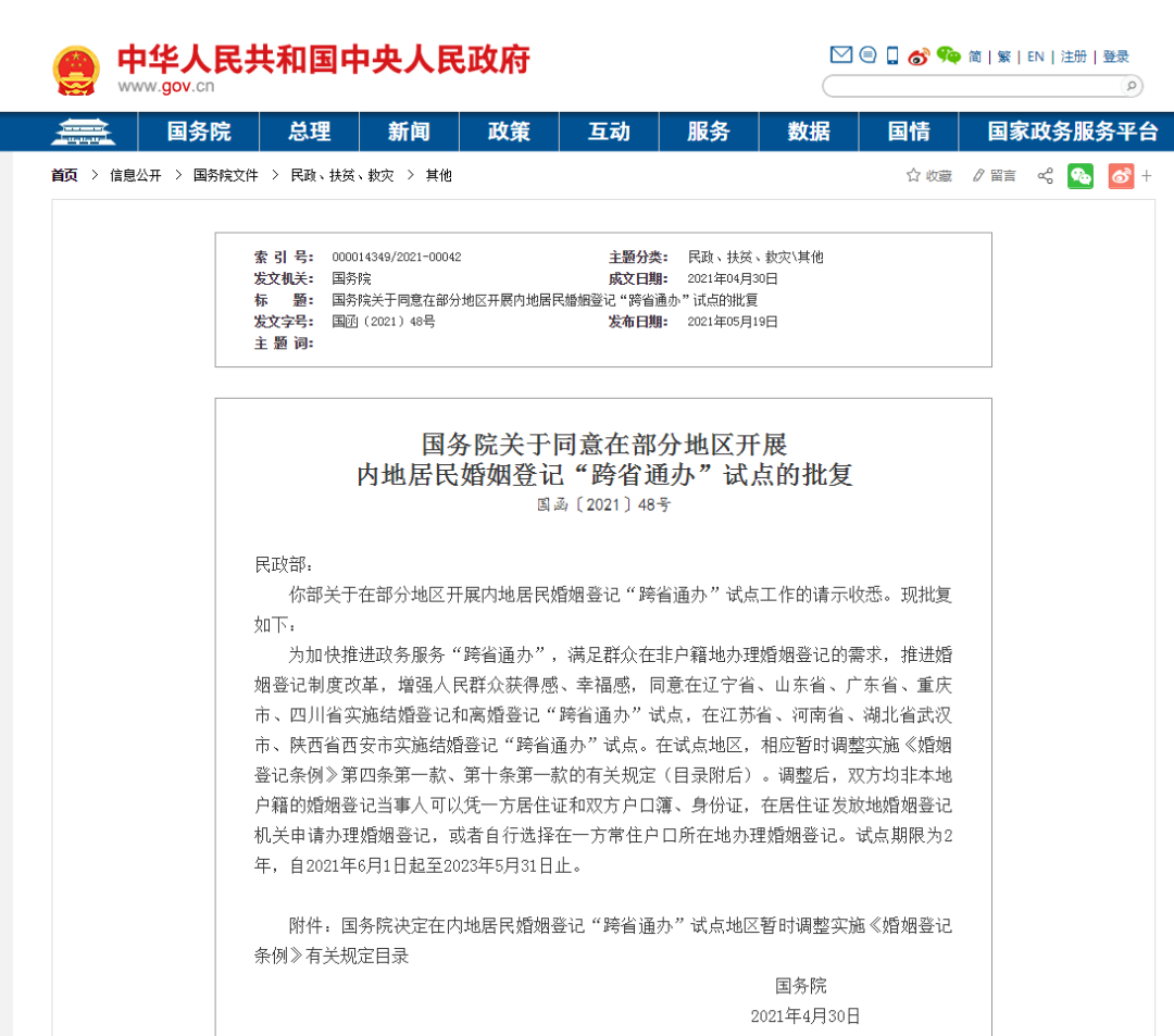 国务院关于同意在部分地区开展内地居民婚姻登记“跨省通办”试点的批复 国函〔2021〕48号 民政部: 你部关于在部分地区开展内地居民婚姻登记“跨省通办”试点工作的请示收悉。现批复如下: 为加快推进政务服务“跨省通办”,满足群众在非户籍地办理婚姻登记的需求,推进婚姻登记制度改革,增强人民群众获得感、幸福感,同意在辽宁省、山东省、广东省、重庆市、四川省实施结婚登记和离婚登记“跨省通办”试点,在江苏省、河南省、湖北省武汉市、陕西省西安市实施结婚登记“跨省通办”试点。在试点地区,相应暂时调整实施《婚姻登记条例》第四条第一款、第十条第一款的有关规定(目录附后)。调整后,双方均非本地户籍的婚姻登记当事人可以凭一方居住证和双方户口簿、身份证,在居住证发放地婚姻登记机关申请办理婚姻登记,或者自行选择在一方常住户口所在地办理婚姻登记。试点期限为2年,自2021年6月1日起至2023年5月31日止。 附件:国务院决定在内地居民婚姻登记“跨省通办”试点地区暂时调整实施《婚姻登记条例》有关规定目录 国务院 2021年4月30日 (此件公开发布) 附件 国务院决定在内地居民婚姻登记“跨省通办”试点地区暂时调整实施《婚姻登记条例》有关规定目录
