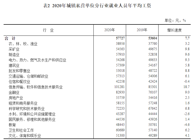 2020年全国城镇私营单位就业人员 年平均工资为57727元