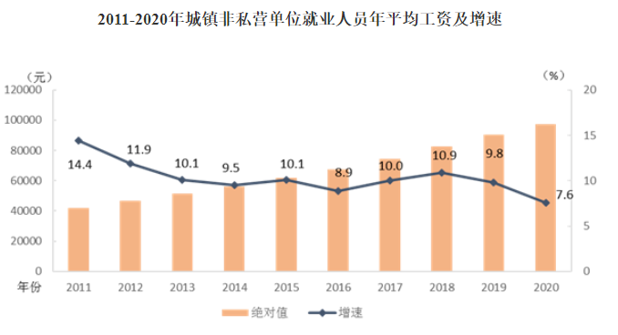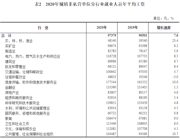2020年全国城镇非私营单位就业人员年平均工资为97379元,比上年增加6878元,名义增长7.6%,增速比2019年回落2.2个百分点。扣除价格因素,2020年全国城镇非私营单位就业人员年平均工资实际增长5.2%。