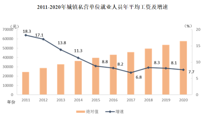 2020年全国城镇私营单位就业人员年平均工资为57727元,比上年增加4123元,名义增长7.7%,增速比2019年回落0.4个百分点。扣除价格因素,2020年全国城镇私营单位就业人员年平均工资实际增长5.3%。