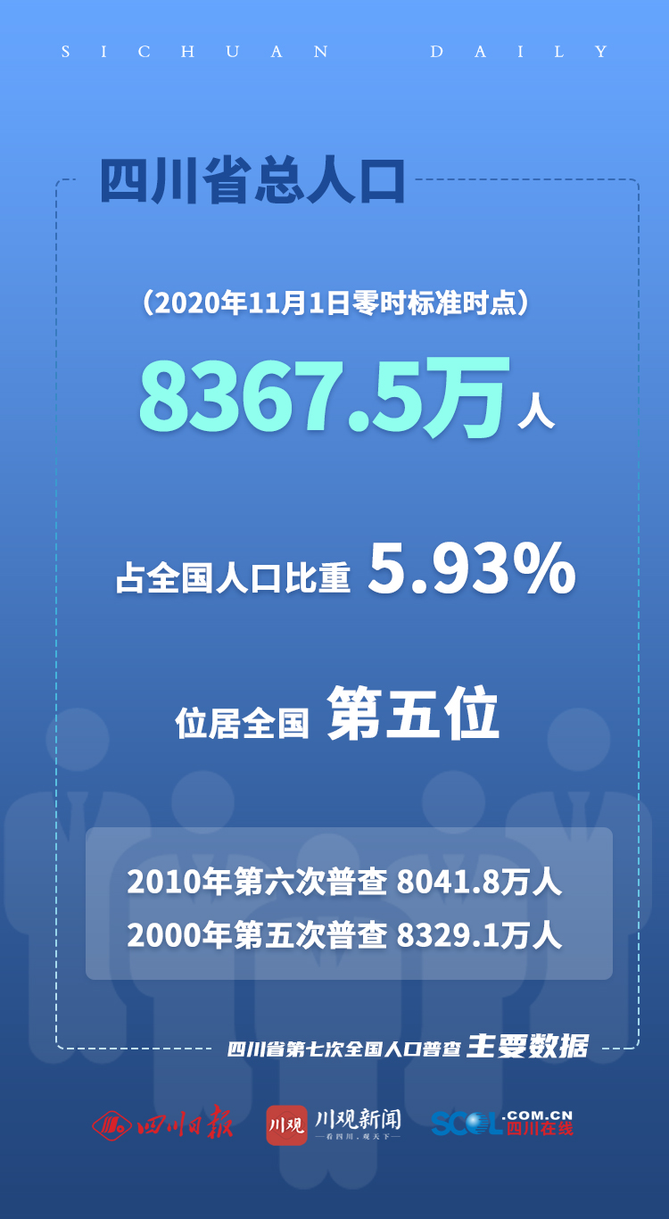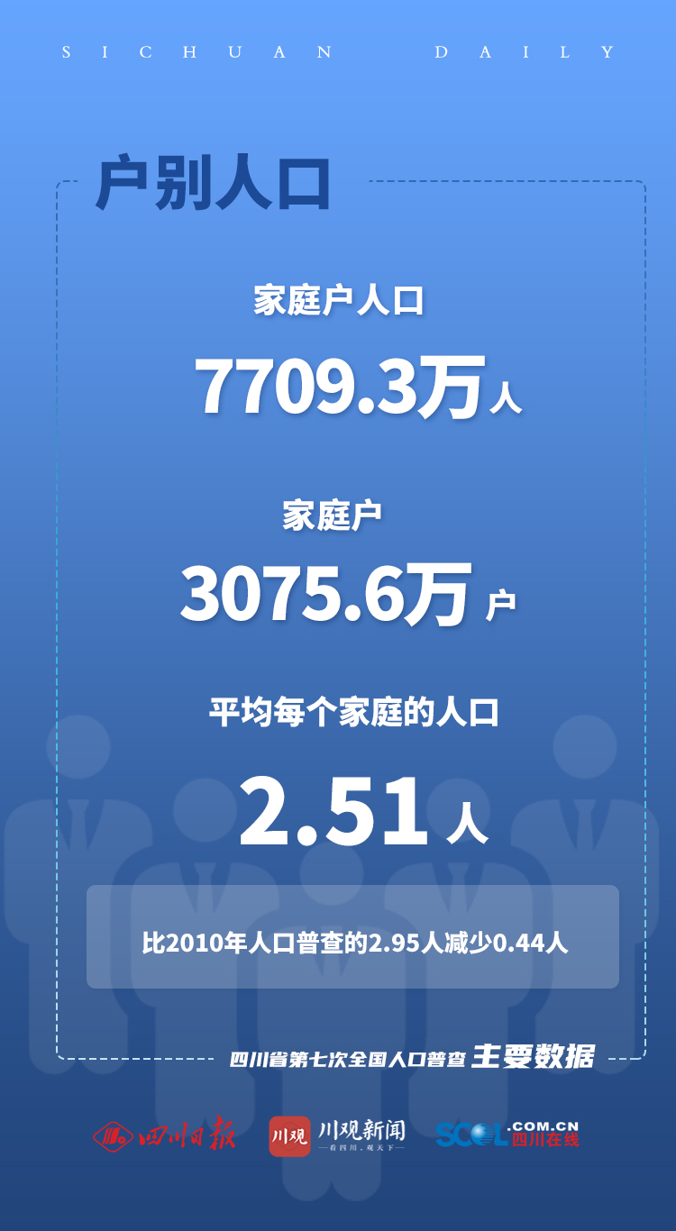 全省常住人口共8367.5万人。与2010年第六次全国人口普查8041.8万人相比,过去十年间,我省常住人口增加325.7万人,增长4.05%,年平均增长率为0.4%。全省常住人口总量位居全国第五,占全国人口比重5.93%。“十年来,我省常住人口保持了平稳增长态势,这与我省经济持续加快发展,保持全国经济大省的地位密不可分。”四川省统计局局长、四川省第七次全国人口普查领导小组副组长兼办公室主任范毅在发布会上分析指出。普查结果显示,四川共有家庭户3075.6万户,家庭户人口为7709.3万人;集体户144.9万户,集体户人口为658.2万人。平均每个家庭户的人口为2.51人,比2010年的2.95少0.44人。
