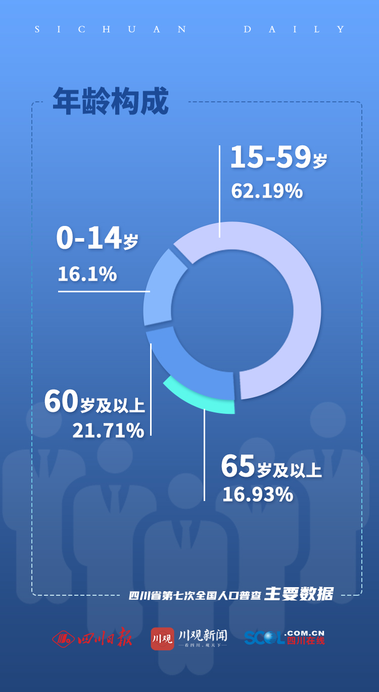 根据普查结果显示,四川全省0–14岁人口为1347.1万人,占16.1%; 15-59岁人口为5204万人, 占62.19%;60岁及以上人口为1816.4万人,占21.71%(其中,65岁及以上人口为1416.8万人,占16.93%)。