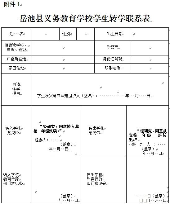 3.转学具体要求:(1)县内转学生填写《岳池县义务教育学校学生转学联系表》,必须经转出学校签字同意并加盖学校公章,县外转学生填写《岳池县义务教育学校学生转学联系表》,并附转出学校的学籍证明,交九龙城区教育督导责任区审核登记,再报县教科体局学义股备案;(2)城区各义务教育学校之间原则上不得转学,一律不得私自接收转学生;(3)接收学校认真审核转入学生各种有效证件,对符合城区就读条件的转学生才能报名注册。