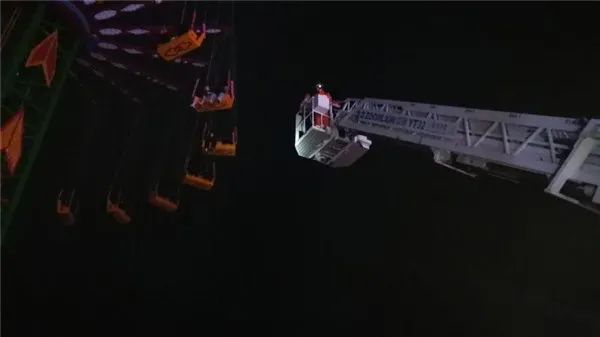 20时10分,救援力量到达现场后勘查发现,3名游客被困在高约10米的高空娱乐设施“旋转飞椅”上,由于该设施已断电失控,随时可能发生意外情况。现场指挥员立即下令启动云梯消防车进行救援,2名消防员穿戴好个人防护装备登上云梯进行救助,其余人员负责现场警戒及保护。随着云梯车的升起,游客的情绪也逐渐平复下来。
