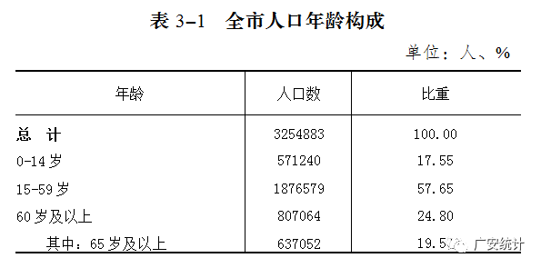 根据第七次全国人口普查结果,现将2020年11月1日零时全市人口的基本情况公布如下:全市常住人口为3254883人,与2010年第六次全国人口普查相比,增加49407人,增长1.54%,年平均增长0.15%。全市共有家庭户1284068户,集体户32497户,家庭户人口为3090331人,集体户人口为164552人。平均每个家庭户的人口为2.41人,比2010年第六次全国人口普查结果减少0.36人。6个县(市、区)中,常住人口超过70万人的有3个,其余县(市、区)的常住人口都在70万人以下,其中常住人口在70万人至75万人之间的有3个;在50万人至60万人之间的有1个;少于30万人的有2个。常住人口居前三位的是广安区、岳池县和邻水县,合计占全市常住人口比重为67.42%。