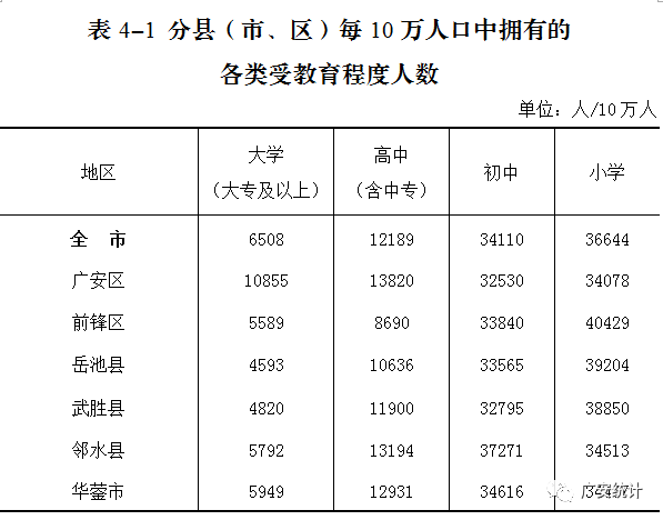 与2010年第六次全国人口普查相比,全市常住人口中,15岁及以上人口的平均受教育年限由7.76年提高至8.48年。全市常住人口中,文盲人口(15岁及以上不识字的人)为116746人,文盲率[5]为3.59%,与2010年第六次全国人口普查相比,文盲率下降3.78个百分点。[2]常住人口包括:居住在本乡镇街道且户口在本乡镇街道或户口待定的人;居住在本乡镇街道且离开户口登记地所在的乡镇街道半年以上的人;户口在本乡镇街道且外出不满半年或在境外工作学习的人。[3]平均受教育年限是将各种受教育程度折算成受教育年限计算平均数得出的,具体的折算标准是:小学=6年,初中=9年,高中=12年,大专及以上=16年。[4] 因2013年广安区和前锋区行政区划调整,2010年广安区和前锋区15岁及以上人口平均受教育年限数据已按调整后行政区划作了修订。[5]文盲率是指常住人口中15岁及以上不识字人口占常住人口总量的比例。
