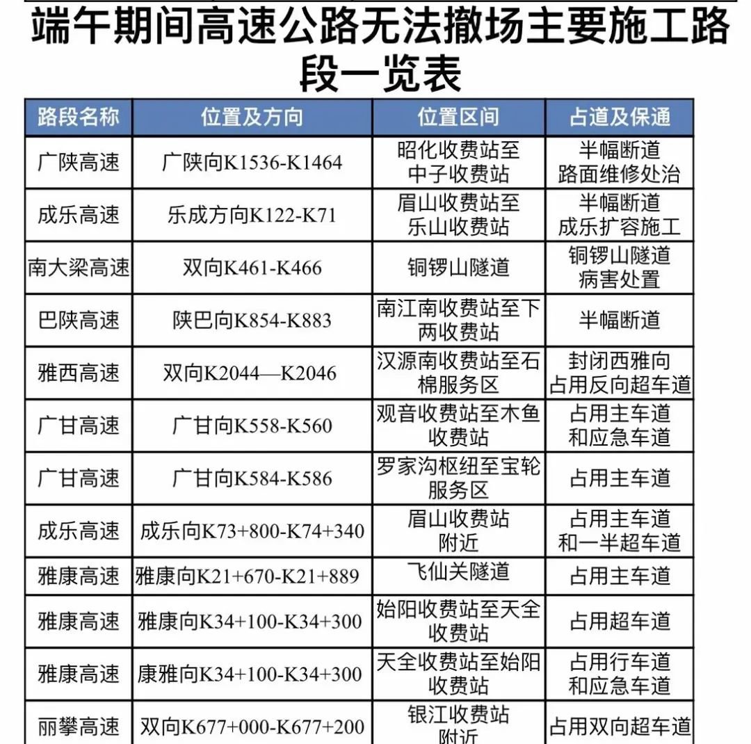 端午假期,四川高速公路禁止危险化学品运输车辆通行,暂停对运输超限超载不可解体物品车辆允许通行高速公路的意见反馈,返程高峰时段(6月14日)执行12时至20时禁止三轴(含三轴)以上(不含鲜活农产品运输车)重型货运车辆进入高速公路的临时交通管制措施。高速公路流量将主要以客车流量为主。