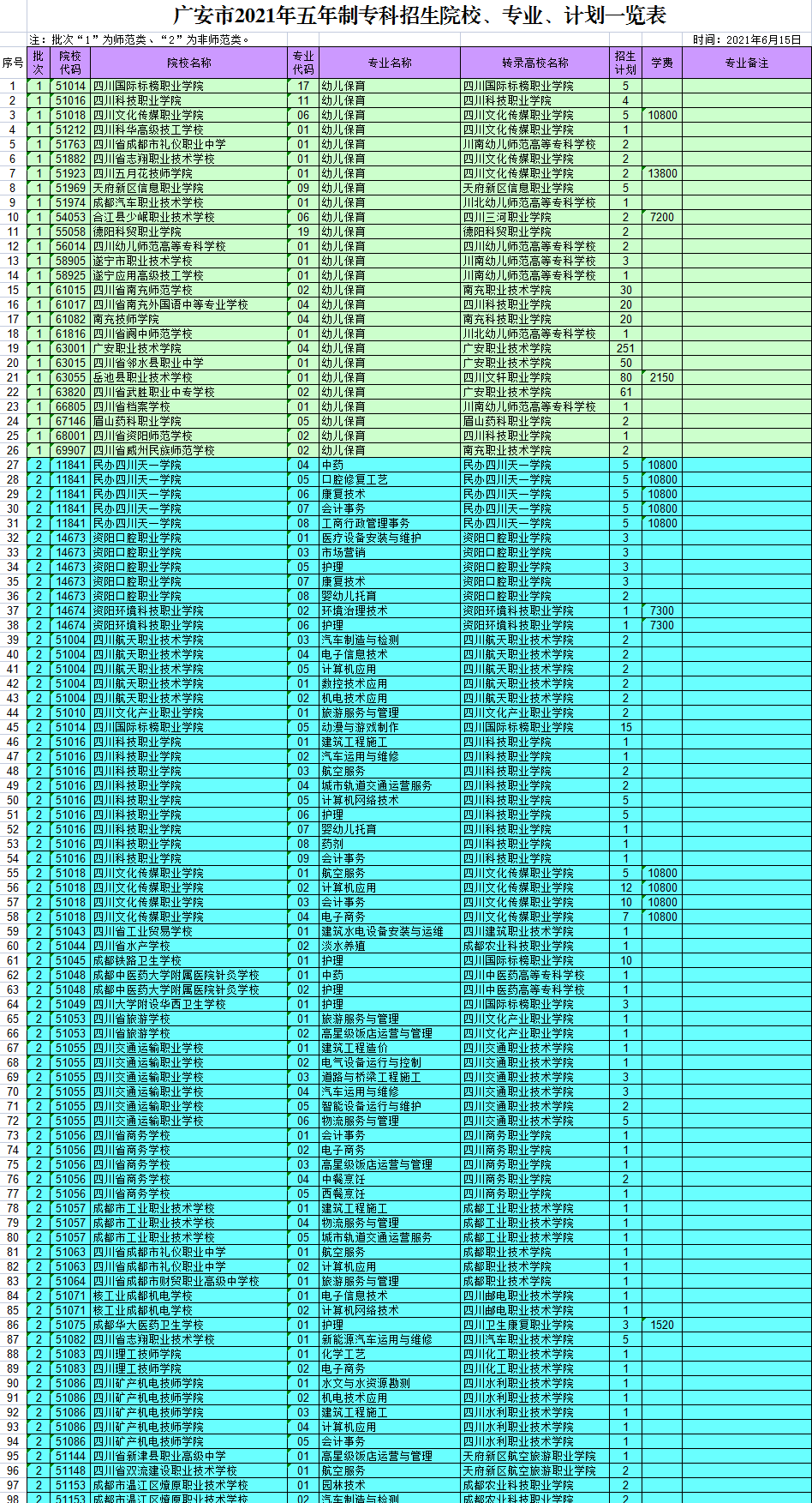 现将广安市2021年五年制专科招生院校、专业、计划公布如下。 温馨提示 五年制专科志愿填报,全市统一于7月1日8:30至7月3日18:00在广安市高中阶段学校招生信息服务平台(http://182.151.23.226:18001/iexam/) 上进行网上填报。