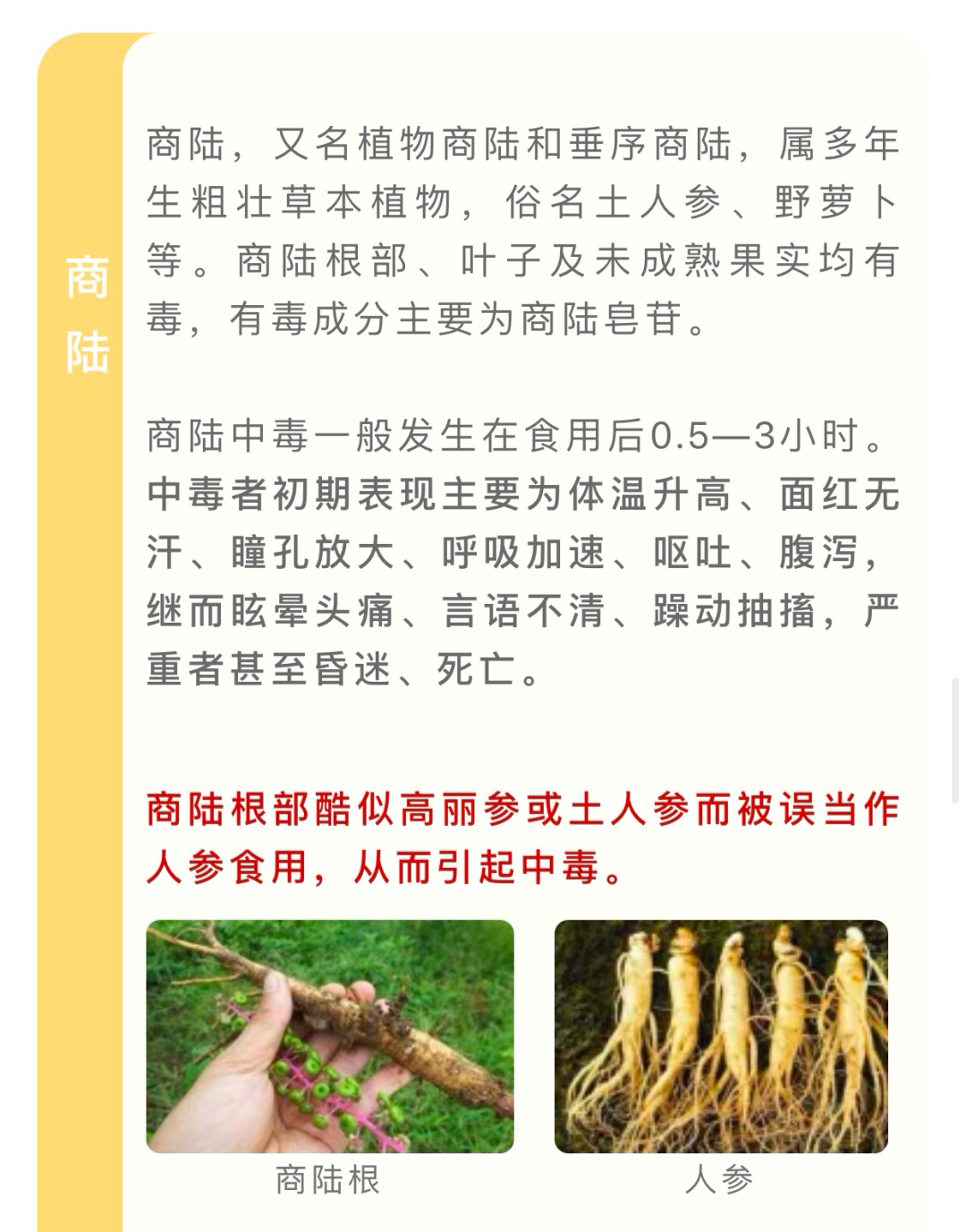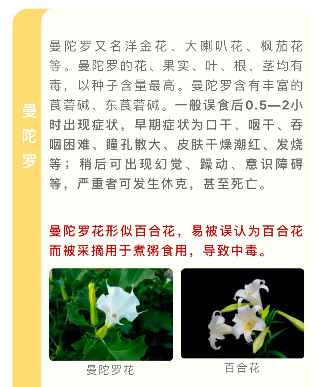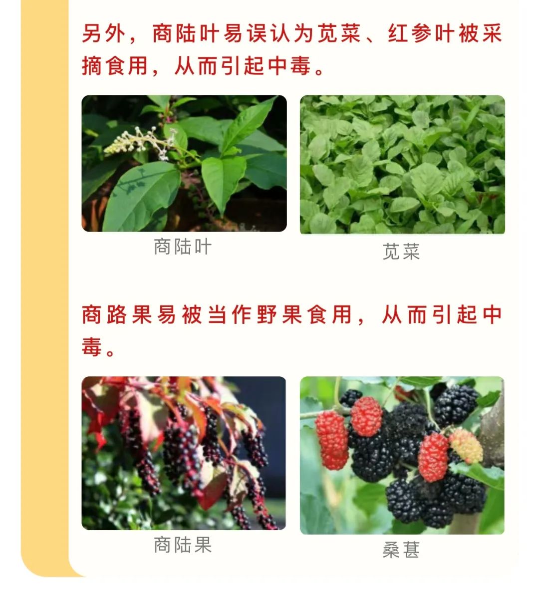 因此,夏季常见有毒植物的辨别 及食物中毒的预防尤其重要! ↓↓↓ 有毒 植物果实 有毒 植物花、菜 有毒 植物根茎 说了这么多 给大家打个总结 对不认识、不熟悉的野花、野果与野菜不采摘、不食用。 对于熟知的可食用野菜、野果的采摘要注重新鲜,生食应清洗干净;对不宜生食的可食用野菜,需要经过合理的加工烹调后再食用。 如果误食有毒植物,应立即催吐,减少毒素吸收,并尽快就医;同时,要保存可疑植物,以备检验、诊断和治疗。