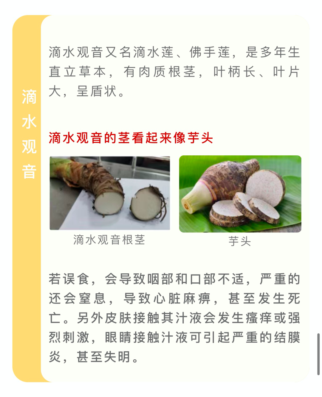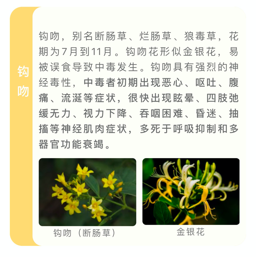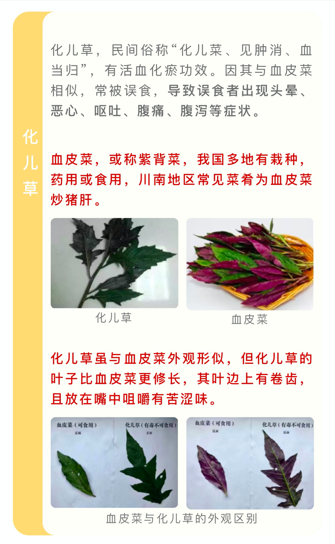 因此,夏季常见有毒植物的辨别 及食物中毒的预防尤其重要! ↓↓↓ 有毒 植物果实 有毒 植物花、菜 有毒 植物根茎 说了这么多 给大家打个总结 对不认识、不熟悉的野花、野果与野菜不采摘、不食用。 对于熟知的可食用野菜、野果的采摘要注重新鲜,生食应清洗干净;对不宜生食的可食用野菜,需要经过合理的加工烹调后再食用。 如果误食有毒植物,应立即催吐,减少毒素吸收,并尽快就医;同时,要保存可疑植物,以备检验、诊断和治疗。