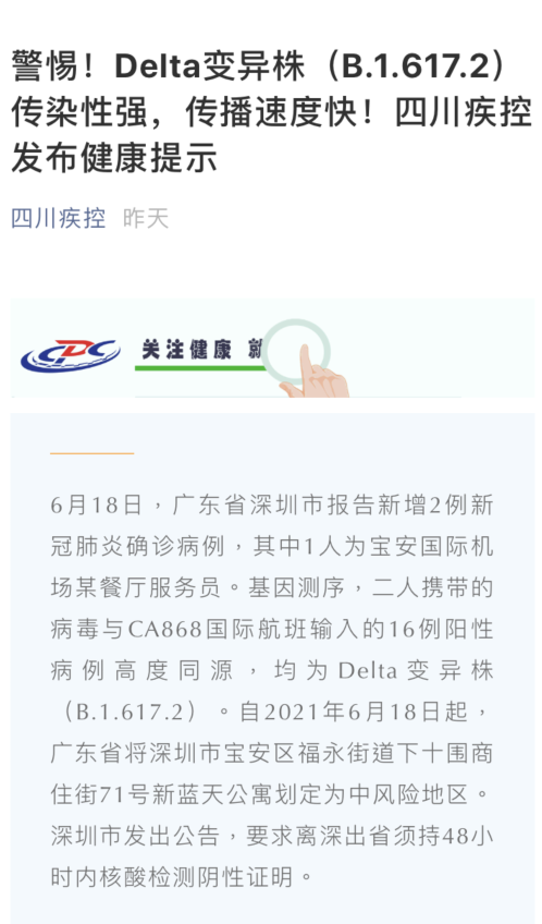 6月20日晚,四川疾控发出提醒,近日深圳新增确诊的新冠病例感染的是传染力强的德尔塔(Delta)变异毒株。据报道,德尔塔毒株正成为全球主要流行的变异新冠毒株,英国、俄罗斯等国新增病例感染德尔塔变异毒株的比例较高。