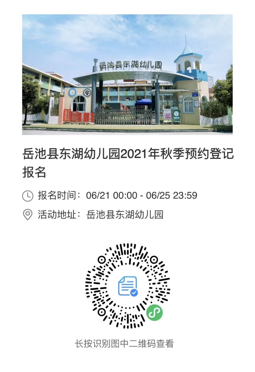 为贯彻落实岳池县教科体局关于做好全县幼儿入园的相关文件精神,进一步规范招生工作,确保我园招生工作正常有序,结合我园实际情况特制订2021年秋季招生方案,具体如下: 1 招生原则 1.坚持“公平、公正、公开”原则; 2.符合条件的每位适龄幼儿都能顺利入园原则。 2 招生范围 幼儿园招生不限户籍,根据幼儿园班级设置及教师配置情况,先预约登记后进行现场资料审核通过即为报名成功,直至全园幼儿名额额满为止。 3 招生对象 2015年9月1日—2016年8月31日之间出生的幼儿。 4 预登记时间 5 预登记方式 时间:上午 8:30—11:30 下午15:30—17:00 地点:岳池县东湖幼儿园一楼办公室 备注:在现场登记成功的幼儿,不用在网上重复登记。 第一步:扫描识别下方小程序,进入“预约登记”页面。 第二步:报名开始后,点击“立即预约”并按要求填写基本信息。(所填信息需真实有效) 第三步:确认所有信息正确填写后,点击提交,即可完成网上预约登记。 6 资料审核 幼儿园根据招生计划及幼儿园实际情况,分批通知符合条件的幼儿家长进行证件审核,审核需持以下资料: 7 咨询电话 8 注意事项 1.审核资料时请家长带孩子参加,每位孩子仅限一名家长入园登记,并按要求带好审核资料。 2.家长来园登记须看管好自己的孩子,安全自行负责。 5.每位幼儿仅限一所公、民办幼儿园进行报名预登记,若发现有同时到2所及以上幼儿园进行登记的,其报名登记信息一律作废。
