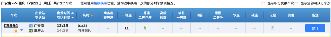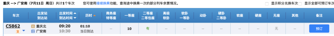 一个好消息是,7月11日起,广安南往返重庆北的班车恢复各一个班次。C5864次列车,从广安南至重庆北,发车时间为13:15,历时1小时24分;C5862次列车,从重庆北至广安南,发车时间为9:20,历时1小时10分。
