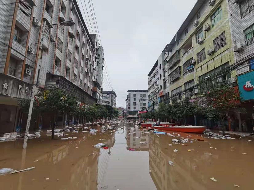 7月12日上午9时,记者在岳池县罗渡镇看到,渠江洪峰正在经过罗渡镇,沿江一楼门市以及部分低洼地区进水被淹。