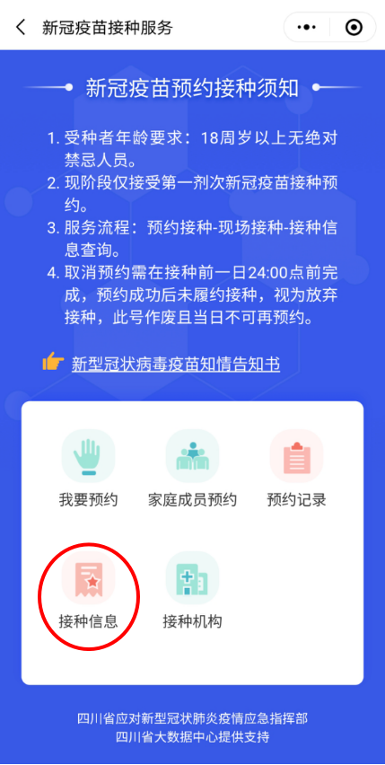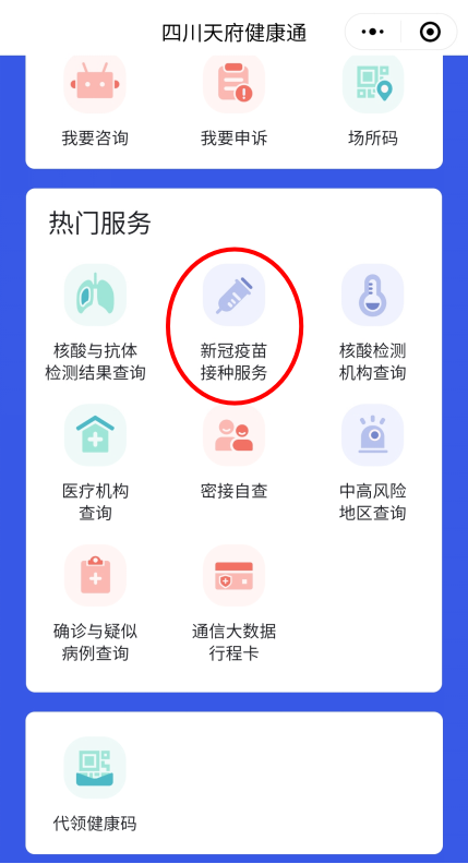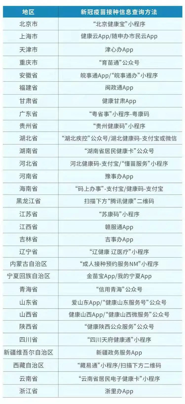 新冠疫苗接种信息查询步骤 1.微信搜索“四川天府健康通”(扫描以下二维码) 2.下滑至热门服务——点击“新冠疫苗接种服务” 3.点击“接种信息” 4.点击“查看详情”即可查询到您的接种时间、疫苗批号、生产企业、及接种单位等信息。 注:每个省份查询程序及方法不一样,以下为整理的各个省份查询平台。