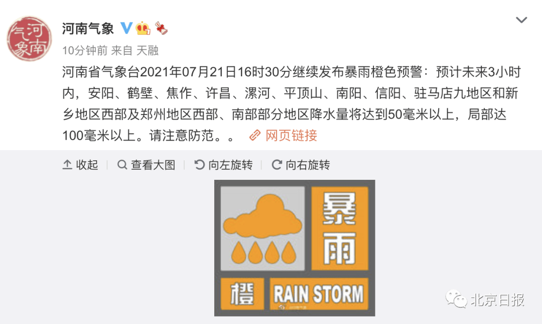 今天16时30分,河南省气象台继续发布暴雨橙色预警:预计未来3小时内,安阳、鹤壁、焦作、许昌、漯河、平顶山、南阳、信阳、驻马店九地区和新乡地区西部及郑州地区西部、南部部分地区降水量将达到50毫米以上,局部达100毫米以上。请注意防范。