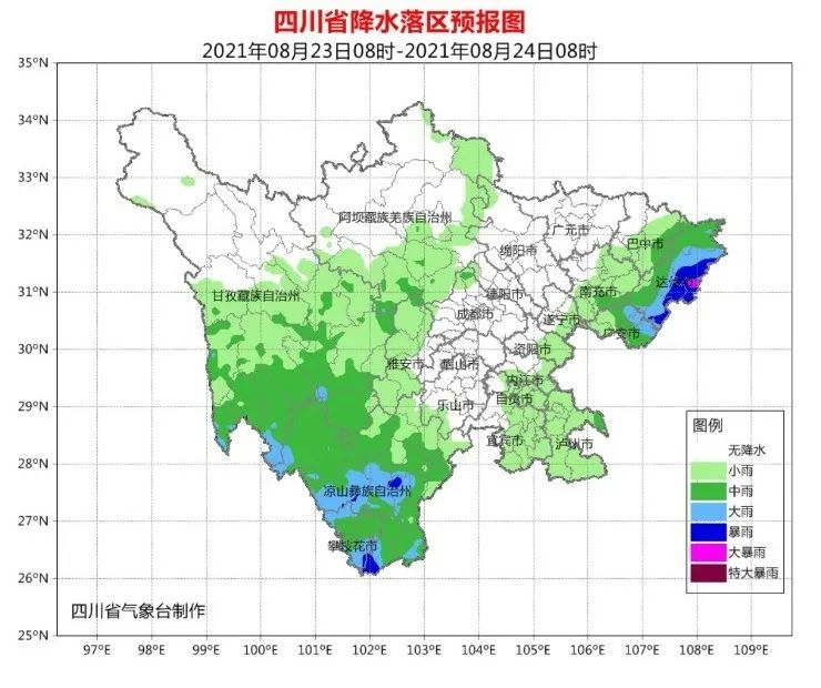 降水方面,预计四川21日至23日有一轮强降雨过程,其中21日晚上到22日白天,广元、巴中、遂宁3市和南充西部,绵阳、德阳2市东部以及雅安北部有暴雨,局部大暴雨;22日晚上到23日白天,达州、广安、巴中、南充4市及泸州北部、内江东部有大雨到暴雨,局部大暴雨,凉山州中部有大雨到暴雨。