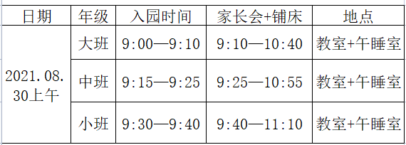 亲爱的大朋友、小朋友们: 大家好!假期生活就要结束了,快乐的幼儿园生活即将开始。带着希望,带着憧憬,我们迎来了新的学期,新的起点。我们将以满腔的热情积极的投入工作,以爱心、耐心、细心、童心和责任心来拥抱我们的小天使们,以饱满的精神、专业的态度和各位家长朋友们共同努力,促进孩子们健康快乐的成长。 老师们都想你们了,孩子们记得要准时回到这个温馨、快乐的大家庭中,继续和老师、小朋友们一起游戏哦! 开 学 时 间 缴费时间及收费标准 缴费时间 收费标准 根据岳发改物价【2012】416号、岳发改物价【2015】497号、岳发改物价【2018】808号文件精神,收费标准如下: 保教费:1500元/学期 生活费、糕点费:1300元/学期(据实核算) 共计:2800元/学期 缴费方式 工商银行线上缴费(具体方式详见班级群“岳池县示范幼儿园保教费操作指引”) 注意事项 请各位家长注意缴费时间,及时完成本学期幼儿缴费工作,缴费完成后截图告知班级教师,以便教师统计人数,以确保学校和班级各项工作的有序开展,敬请悉知。 幼儿注册、铺床 及家长会安排 2021年8月30日(星期一)上午,准时到相应班级铺床,然后在班级召开家长会。 温馨提示: 1、请所有入园参与家长会的家长提前出示四川天府通健康码(绿码),并扫岳池县示范幼儿园场所码,无异常者方可入园。 2、各班分时段错时错峰进行报名注册,并召开班级家长会(不带孩子入园)、铺床等,入园时请各位家长戴好口罩,并配合测量体温。 3、家长请为幼儿准备粉色被套。 4、当天请同时携带幼儿健康报告书、幼儿体温监测报告登记表,新生家长还需携带幼儿预防接种情况审核报告、预防接种证,一并交给班级老师。 作 息 时 间 上午入园时间: 8:20—8:30 大班 8:30—8:40 中班 8:40—9:00 小班 下午离园时间: 4:50—5:10 小班 5:10—5:20 中班 5:20—5:30 大班 温馨提示: 1、幼儿园严格执行封闭式管理和错时错峰上学制度。家长接送幼儿上下学不能进入幼儿园,家长要确认幼儿正常进入幼儿园后方可离开。幼儿在园期间,要与老师保持畅通联系,如有特殊情况请及时配合学校管理。 2、确保幼儿按时上学,降低安全隐患,坚持安全防护,督促幼儿“点对点”往返于家庭与学校,确保幼儿不在上、下学途中进入其他场所,回家后做好消毒工作和体温复检工作。 新 学 期 物 品 准 备 口罩、水杯、隔汗巾、备用衣裤、小雨衣。 亲爱的家长朋友们,让我们携起手来,共同营造安全有序的学习与生活环境,呵护和引领孩子健康、快乐、茁壮成长!诚挚地感谢您的阅读、理解与支持!