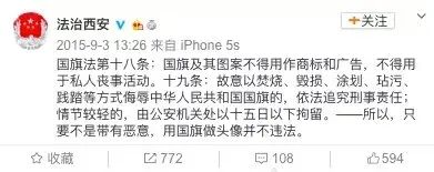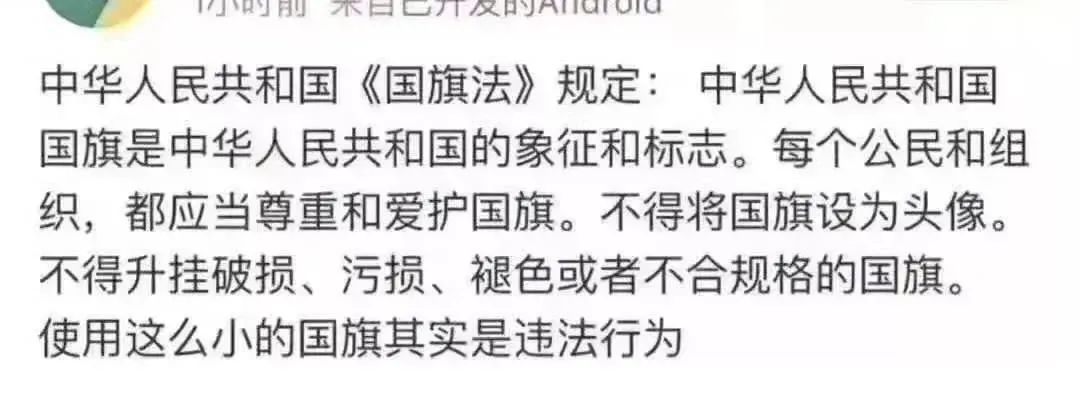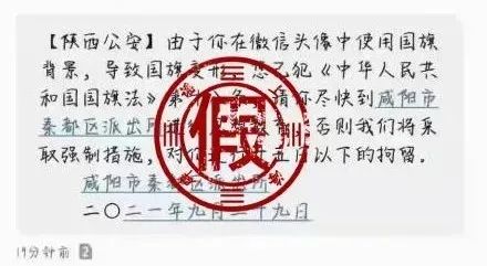然而,如果有人告诉你 这样使用国旗犯法 你是不是会大吃一惊 △网络传言 近日,网上流传着一条疑似陕西公安发出的短信,内容显示:“由于你在微信头像中使用国旗背景,导致国旗变形,您已犯《中华人民共和国国旗法》第十八条,请你尽快到咸阳市秦都区派出所进行思想教育,否则我们将采取强制措施,对你进行十五日以下的拘留。”落款是“咸阳市秦都区派出所,2021年9月29日”。 咸阳市110指挥中心 相关负责人告诉记者 目前该市没有 “咸阳市秦都区派出所”这个机构 只有“咸阳市秦都分局xx派出所” 而且咸阳市公安机关 也没有发出过上述短信 网传消息不实 △网络传言 上述消息还被安在了其它多地派出所的头上,当地公安部门表示,网传消息系谣言。 那么,微信头像使用国旗到底犯法吗? 《中华人民共和国国旗法》第二十条规定:“国旗及其图案不得用作商标、授予专利权的外观设计和商业广告,不得用于私人丧事活动等不适宜的情形。”并没有规定不能用作微信头像。 早在2015年9月3日,陕西省西安市司法局官方微博“@法治西安”就曾科普过:“只要不是带有恶意,用国旗做头像并不违法。” △图片来源:@法治西安 但是,一种情况除外“头像+国旗”可能犯法 如果微商的头像是自己的产品,再在上面加上国旗,就会违反国旗不能用作商标和商业广告的规定,可能涉嫌违法! 此外,《中华人民共和国国旗法》第二十三条规定:“在公共场合故意以焚烧、毁损、涂划、玷污、践踏等方式侮辱中华人民共和国国旗的,依法追究刑事责任;情节较轻的,由公安机关处以十五日以下拘留。” 大家若出于爱国心 想使用国旗做微信头像 需要注意保持国旗的完整性 不得涂划、玷污等 否则就是违法了 除了要爱护国旗 还要尊重国歌 国歌法有哪些规定? 快来重温一下↓