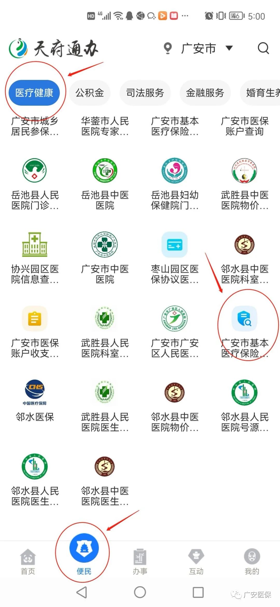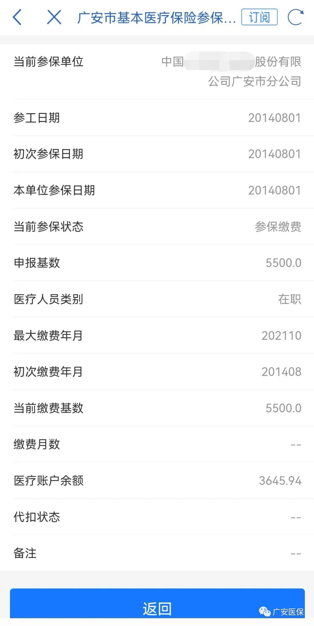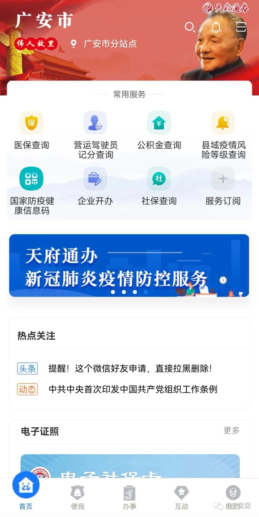 “我的医保当前缴费基数是多少?”“我的参保状态是什么?”…… 这些问题,“天府通办”App都可以回答你。“天府通办广安市分站点”开通了“基本医疗参保信息查询缴费明细查询”服务,广大参保群众可以随时随地查询到自己医保参保状态、医疗账户余额等医保信息。 个人医保参保信息怎么查? 第一步:应用程序下载“天府通办”APP,广安用户自动定位至“广安市分站点”。 第二步:点击“天府通办广安市分站点”主页面下方【便民】按钮,在【医疗健康】下方找到【广安市基本医疗保险参保信息查询】栏目,点击查询。 第三步:查询结果。