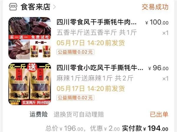 据警方介绍,2019年初,犯罪嫌疑人周某、贺某发现四川特产风干牦牛肉在网上销量好,二人遂决定开淘宝店卖风干牦牛肉。周梦用其父亲的身份证注册公司为金牛区食客来食品经营部,并在淘宝网注册了食客来店销售风干牦牛肉。在整个犯罪过程中,周某负责销售、进货及淘宝客服工作,贺某负责处理淘宝网店运营工作,蒋某负责对牛肉干的包装、收货、发货。