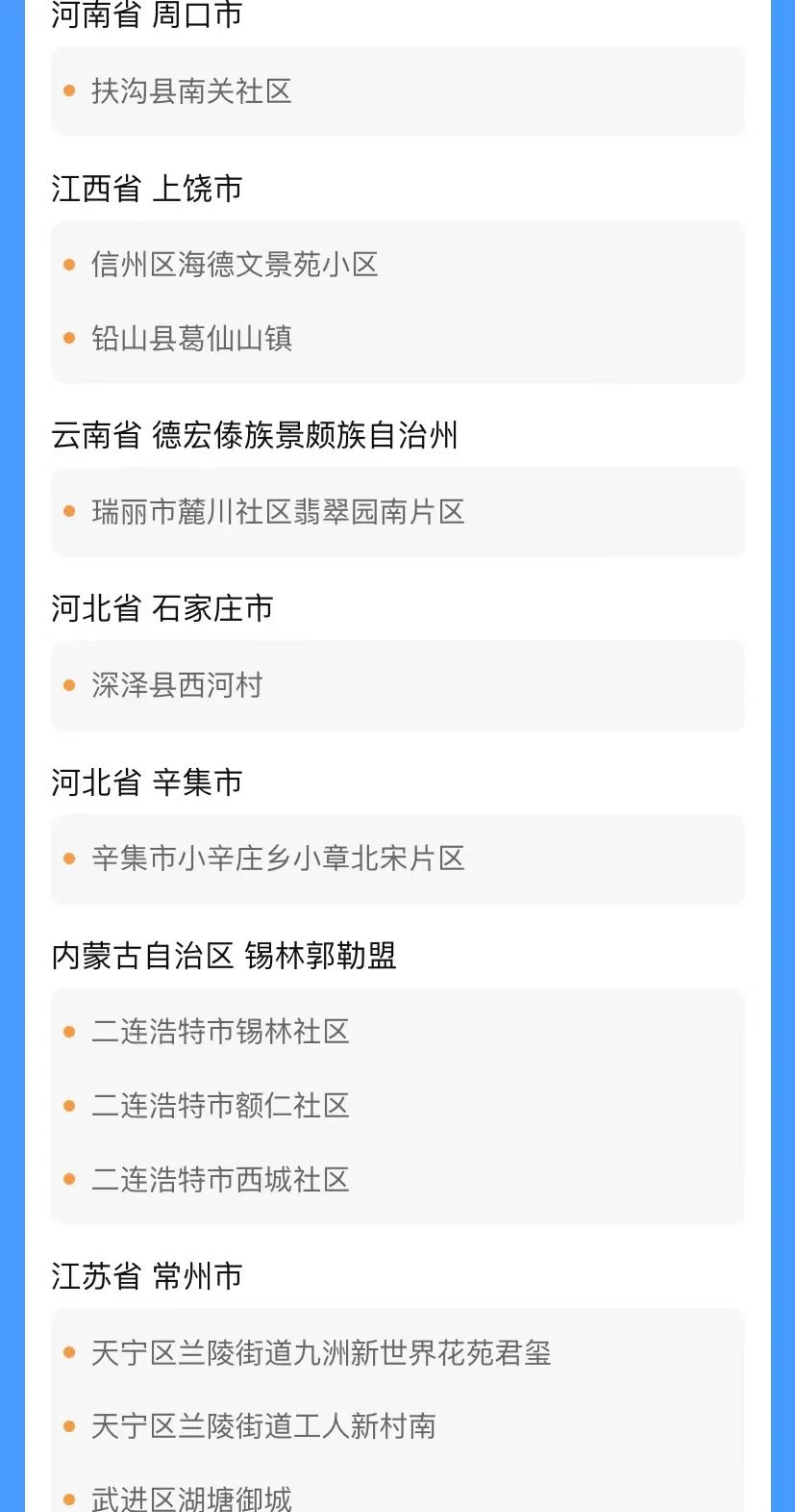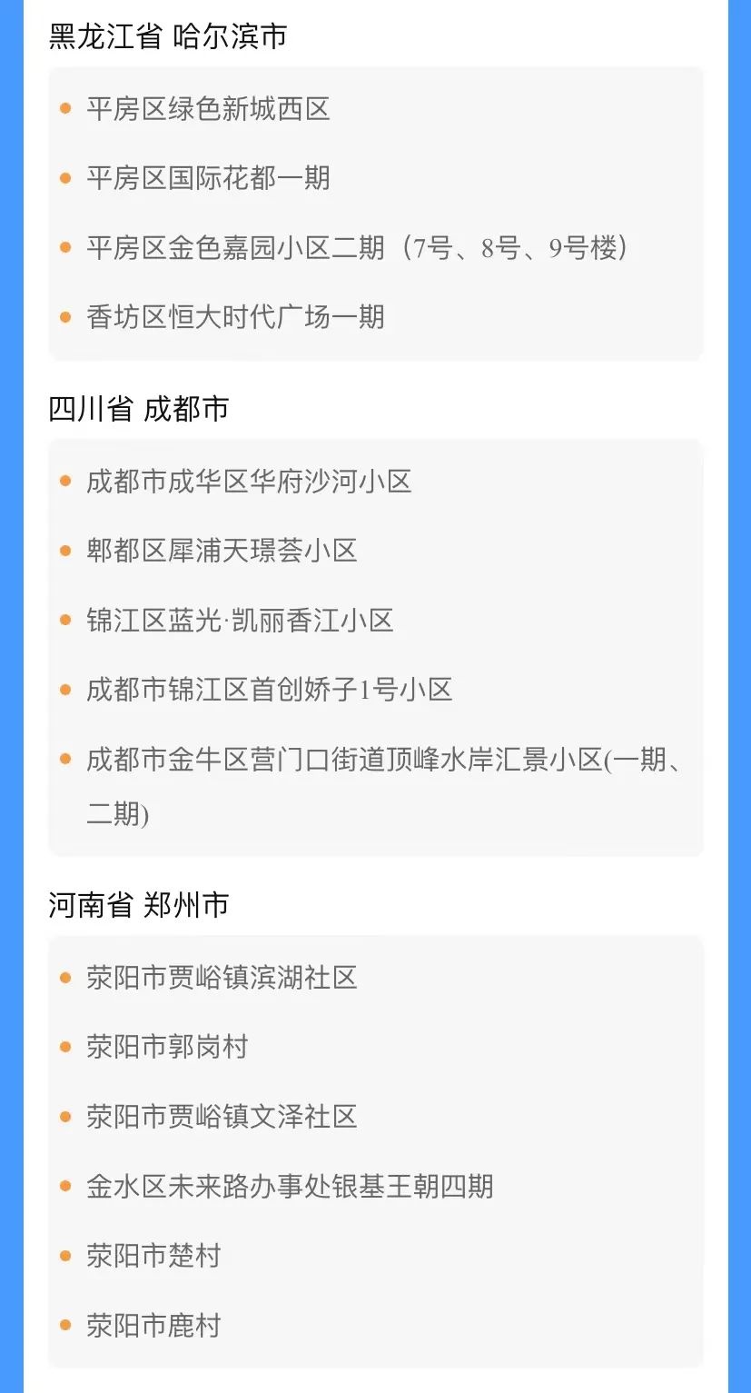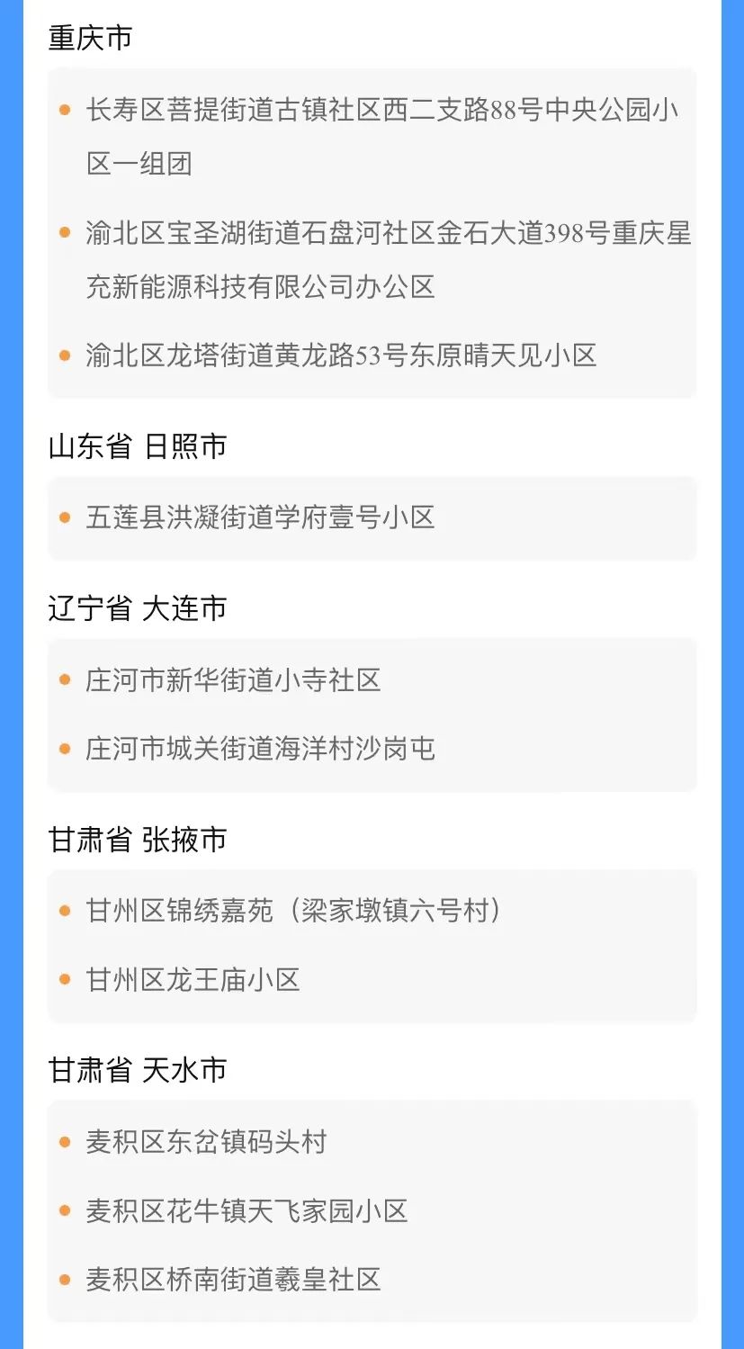国内部分地区来(返)川人员管控措施 管控措施 涉及地区 实施居家或集中隔离,每3天进行1次核酸检测,直至离开旅居地满14天为止。 来(返)川人员主动向入住酒店、单位、社区或居(村)委会报备。 内蒙古自治区锡林郭勒盟二连浩特市,阿拉善盟额济纳旗,呼和浩特市金川开发区、新城区,巴彦淖尔市五原县,鄂尔多斯市伊金霍洛旗。 甘肃省兰州市城关区、七里河区西园街道,张掖市甘州区,天水市麦积区、秦州区。 北京市昌平区北七家镇、东小口镇、城北街道、天通苑南街道、天通苑北街道、流村镇,丰台区新村街道。 宁夏回族自治区银川市金凤区、兴庆区、西夏区,中卫市中宁县。 河北省邢台市信都区,保定市莲池区,石家庄市深泽县、桥西区、裕华区、辛集市、晋州市。 青海省西宁市城西区、城北区。 湖南省株洲市攸县。 云南省德宏州瑞丽市、陇川县。 四川省自贡市富顺县。 山东省日照市五莲县。 黑龙江省黑河市爱辉区,哈尔滨市香坊区、平房区。 江西省上饶市铅山县、广丰区、信州区、广信区,九江市柴桑区。 重庆市巴南区鱼洞街道,渝北区龙溪街道、宝圣湖街道、龙塔街道,长寿区菩提街道,两江新区康美街道。 江苏省常州市天宁区、武进区、新北区。 河南省郑州市荥阳市、金水区,周口市扶沟县。 浙江省嘉兴市桐乡市。 辽宁省大连市庄河市。 实施3天内2次(间隔24小时)核酸检测,均为阴性的,纳入社区管理,健康监测至离开旅居地满14天为止。 来(返)川人员主动向入住酒店、单位、社区或居(村)委会报备。 内蒙古自治区阿拉善盟其他地区,锡林郭勒盟其他地区,呼和浩特市其他地区,巴彦淖尔市其他地区,鄂尔多斯市其他地区。 甘肃省兰州市其他地区,张掖市其他地区,嘉峪关市、酒泉市、陇南市、天水市其他地区。 陕西省西安市雁塔区、碑林区、灞桥区。 北京市昌平区其他地区,丰台区其他地区,海淀区。 宁夏回族自治区银川市其他地区,中卫市其他地区,吴忠市。 河北省邢台市其他地区,保定市其他地区,石家庄市其他地区。 青海省西宁市其他地区。 湖南省长沙市长沙县、雨花区,株洲市其他地区。 云南省德宏州其他地区。 山东省日照市其他地区。 黑龙江省黑河市其他地区,哈尔滨市其他地区。 江西省上饶市其他地区,九江市其他地区。 重庆市九龙坡区,沙坪坝区,两江新区其他地区,长寿区其他地区,渝北区其他地区和巴南区其他地区。 江苏省常州市其他地区。 河南省郑州市其他地区,周口市其他地区。 浙江省嘉兴市其他地区。 辽宁省大连市其他地区。 查验48小时核酸检测阴性报告。 有本土新冠病例和无症状感染者报告省份(自治区、直辖市)旅居史的来(返)川人员。 国内中高风险地区汇总表